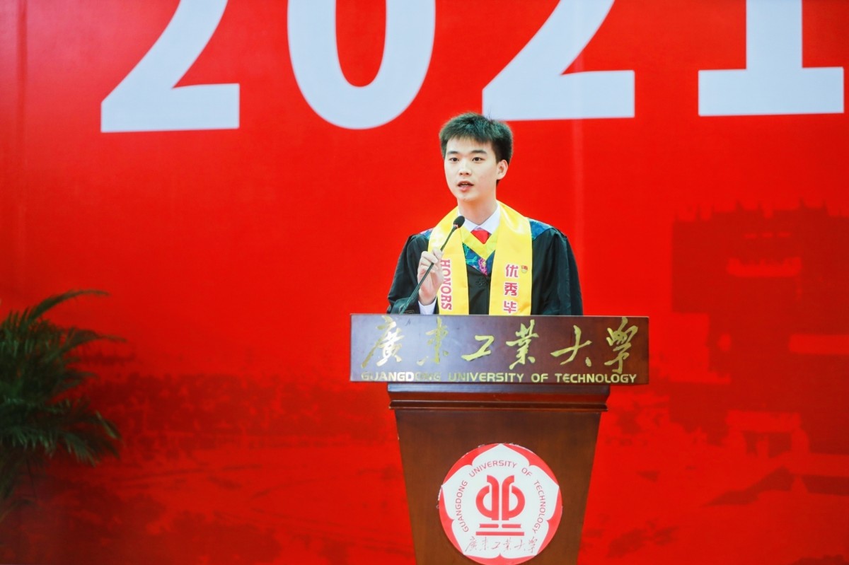 2017级机械电子工程专业的廖智燊作为毕业生代表发言。他回忆了在广工校园的温暖相遇和励志成长,感恩母校培养、师长教导与同学们的互相鼓励陪伴,并表示会用更顽强的奋斗精神去面对困难、用更坚定的信念去追逐梦想、用更强大的内力驱动去继续成长。