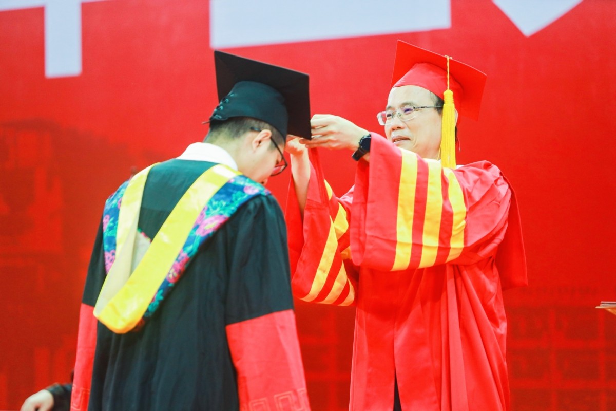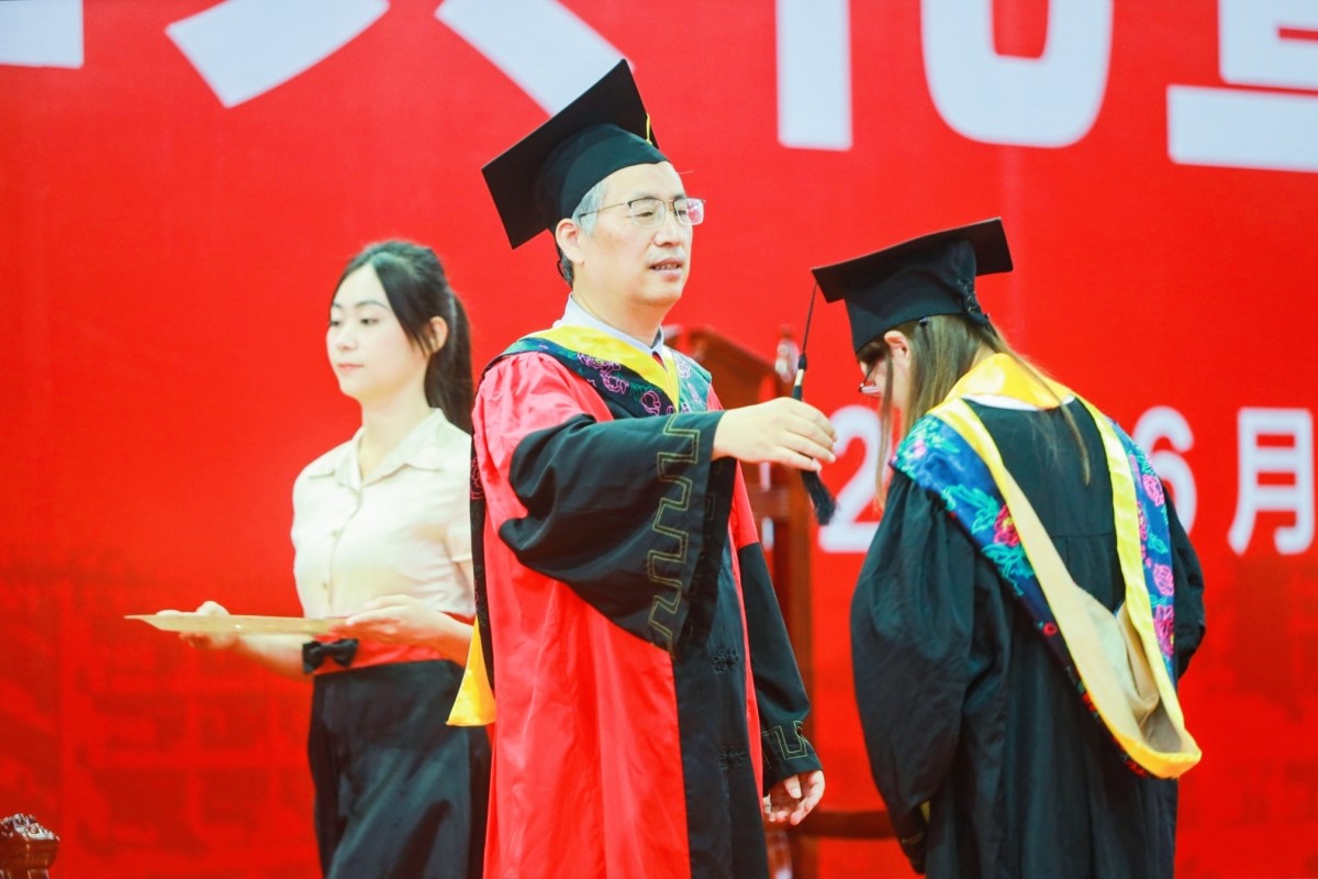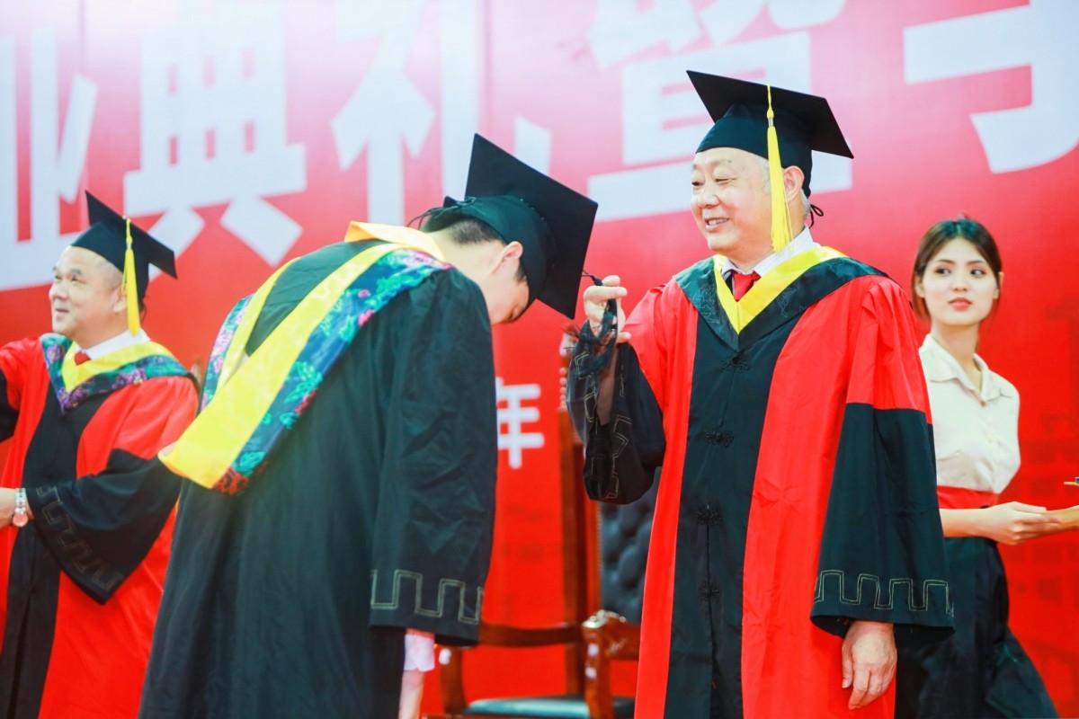 邱学青教授、杜承铭教授、余林教授、谢胜利教授、黄少铭教授为毕业生代表拨穗、授予学位