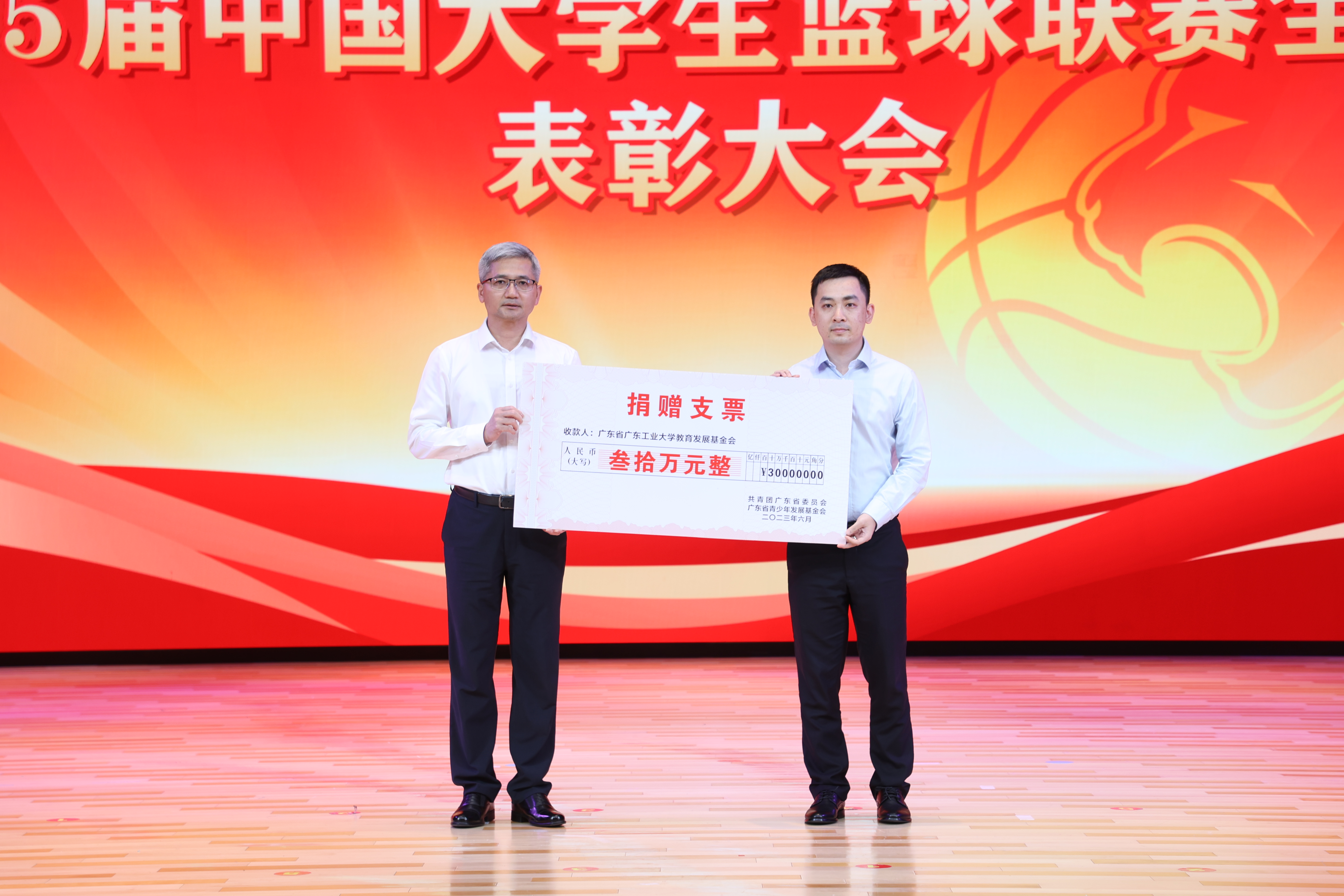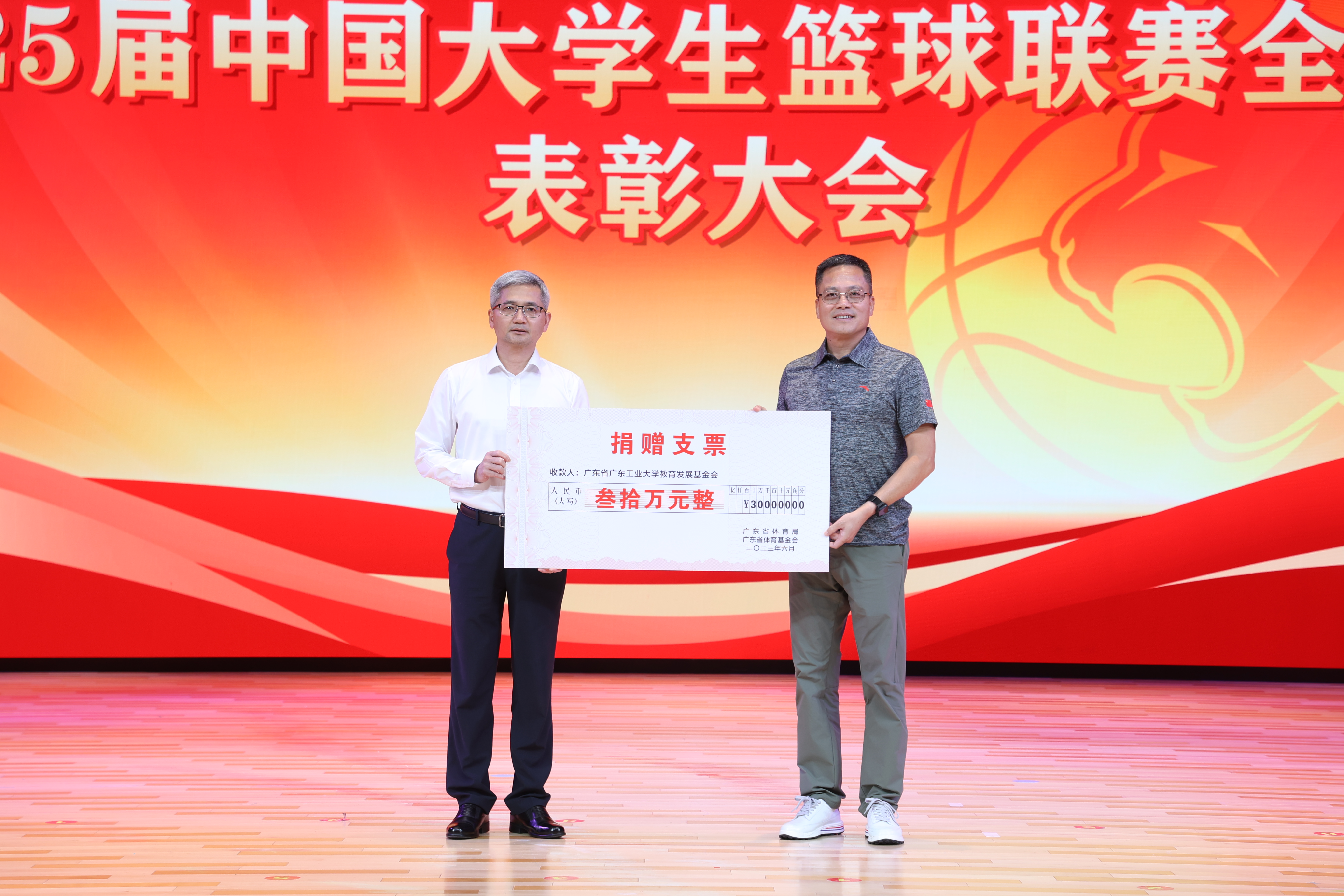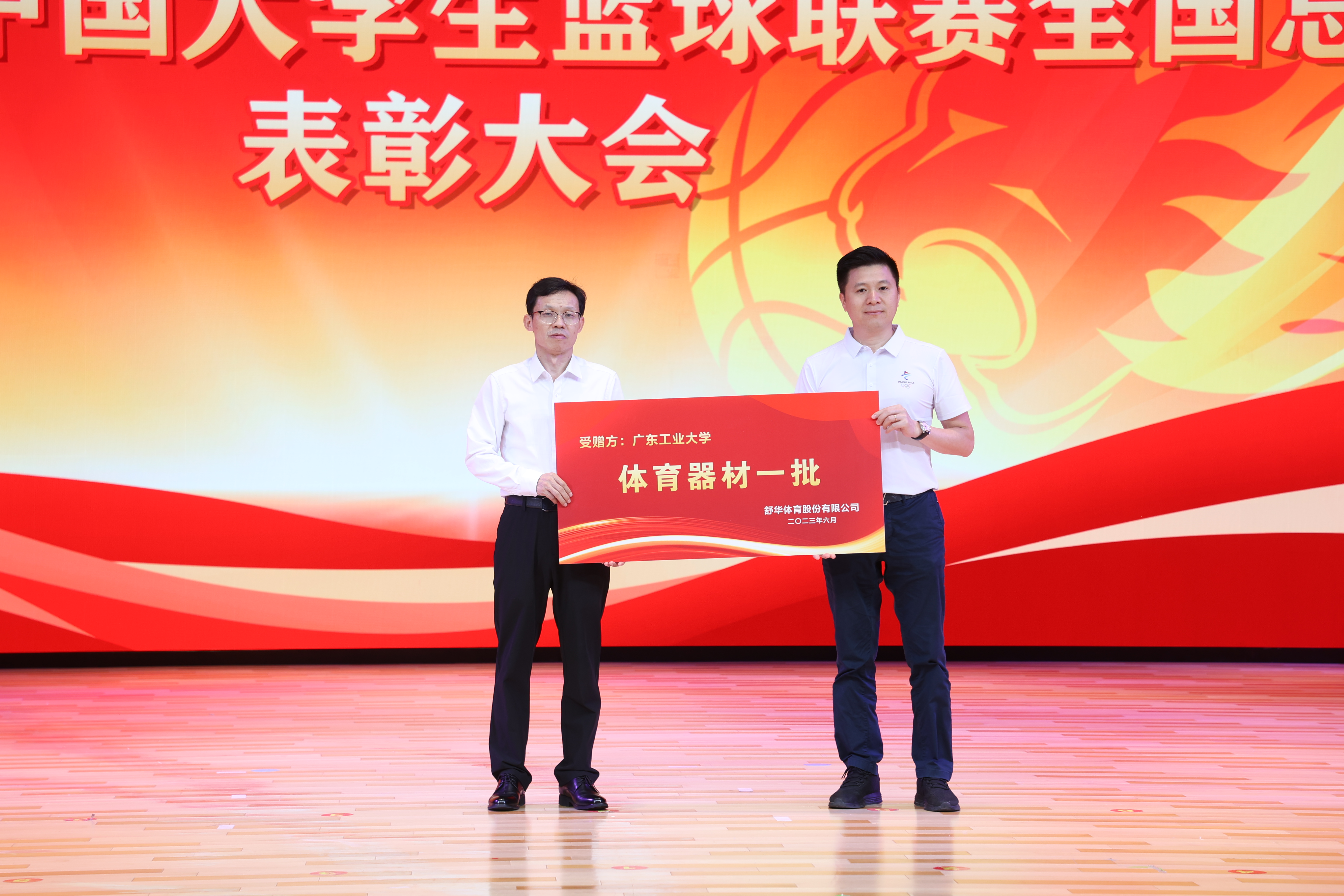 大会进行奖金颁授仪式和体育器材捐赠仪式。6月19日上午,省教育厅专程到机场接机,迎接广工男篮凯旋,并第一时间给予30万元奖励。之后,广东省体育局、团省委牵头分别向广工赠送30万元奖励。广东省体育局还联合相关企业捐赠一批价值30万元的体育器材。另外,一位陈姓校友,向学校捐赠30万元。