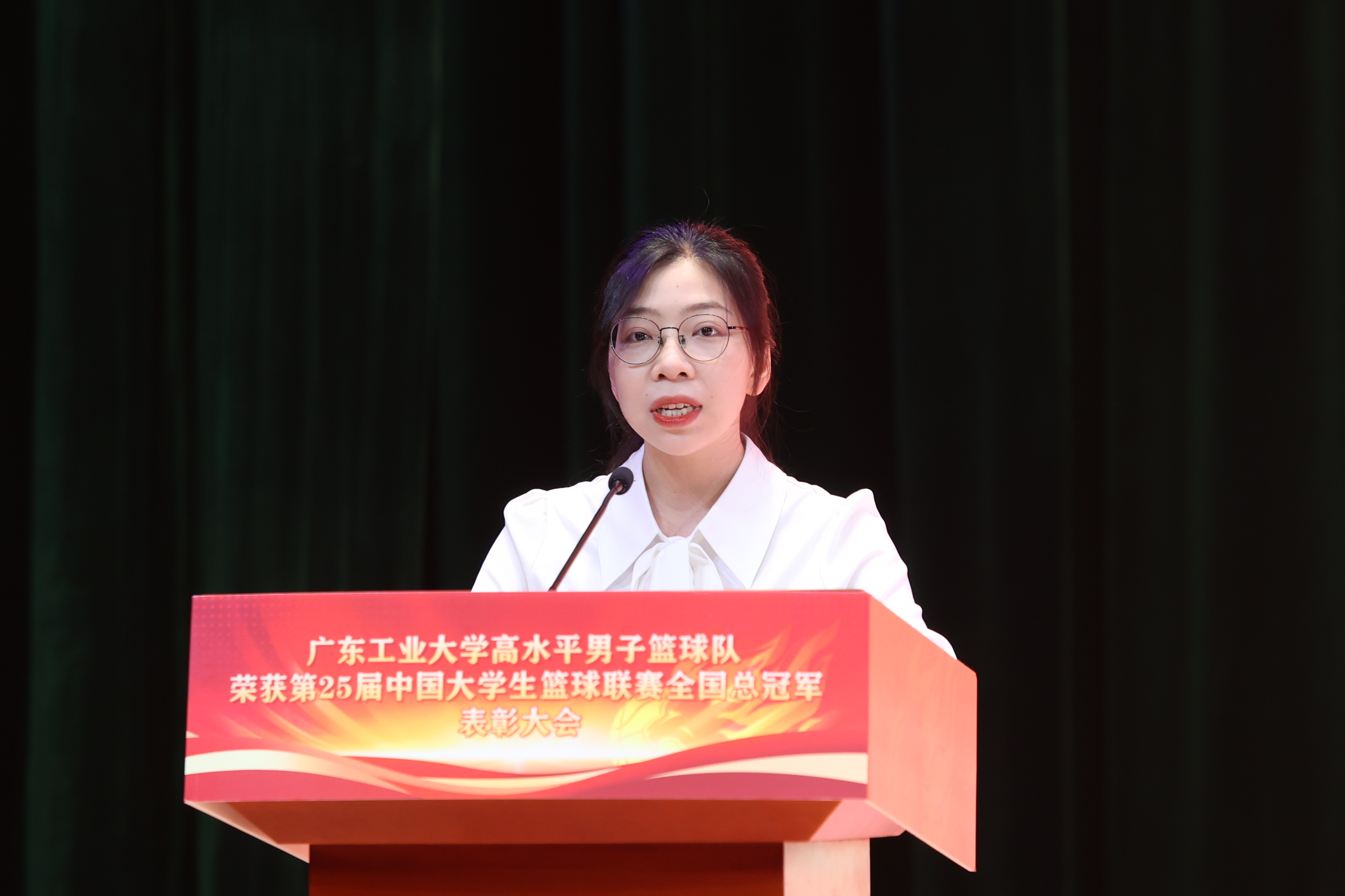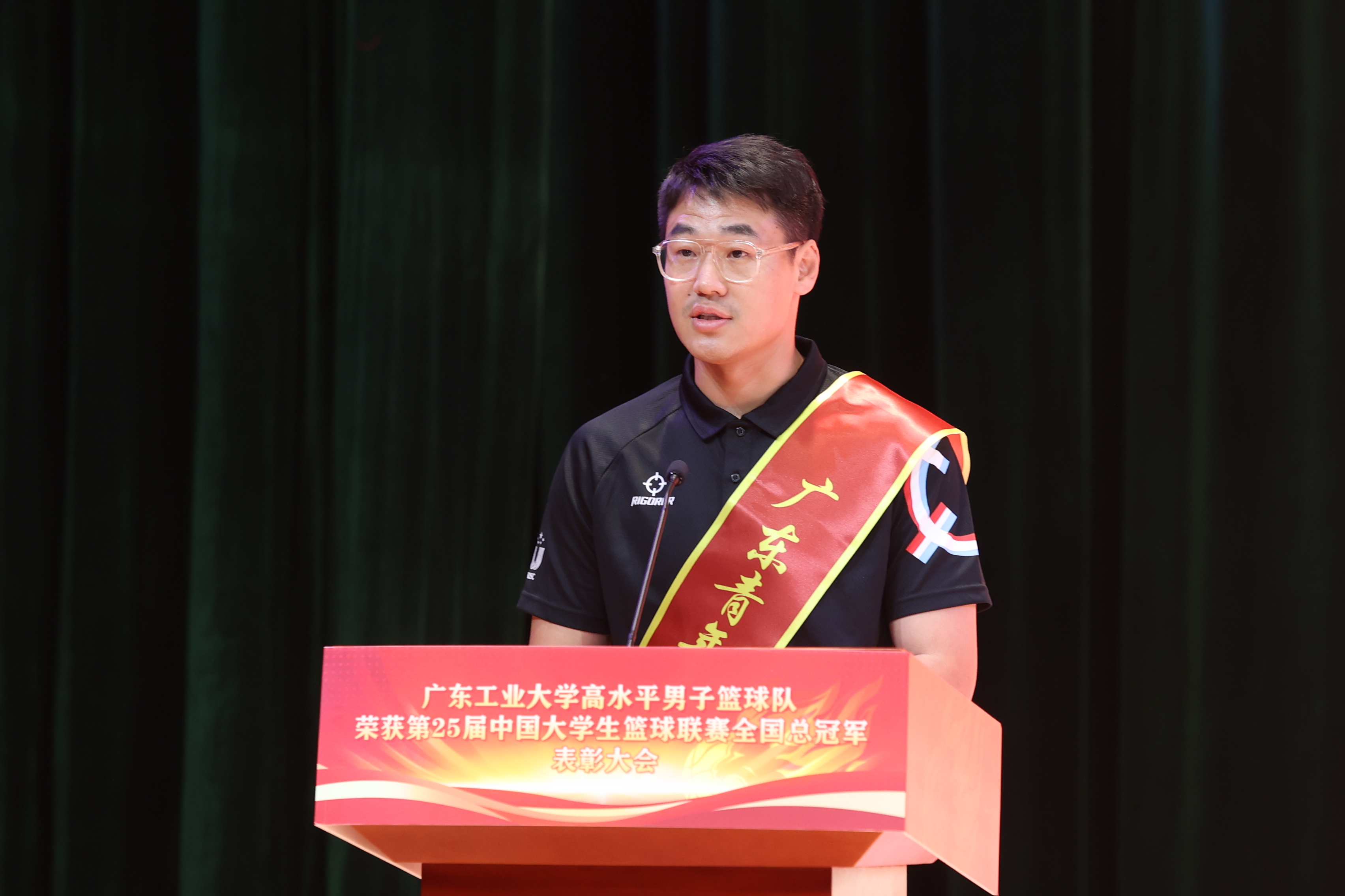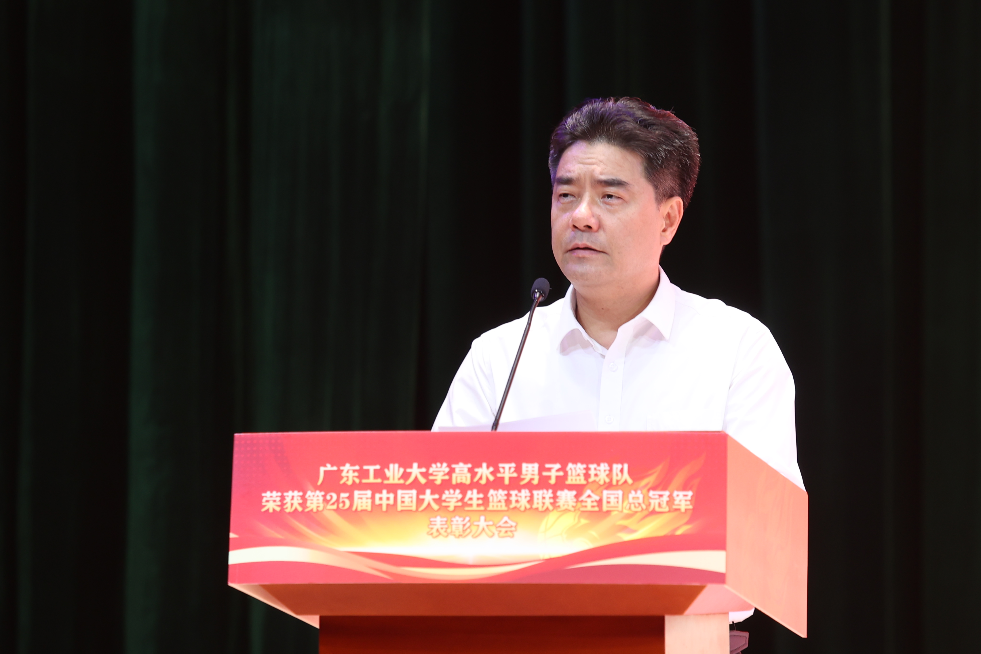 邱学青宣读学校《关于表彰高水平男子篮球队的决定》。学校男篮是新时代广工青年集体的优秀代表。他们展现了脚踏实地、笃行不怠的实干品格,迎难而上、追求卓越的拼搏精神,敢于胜利、为校争光的进取特质,以强烈的历史主动精神寻求突破和超越。为弘扬学校男篮精神,经学校研究决定,授予广工男子篮球队“华体会·官方版网站登录入口先进集体”称号。学校希望全体师生以男子篮球队为榜样,踔厉奋发、勇攀高峰,为全面推进高水平创新型大学建设作出新的更大贡献,为全面建设社会主义现代化国家、全面推进中华民族伟大复兴而团结奋斗。