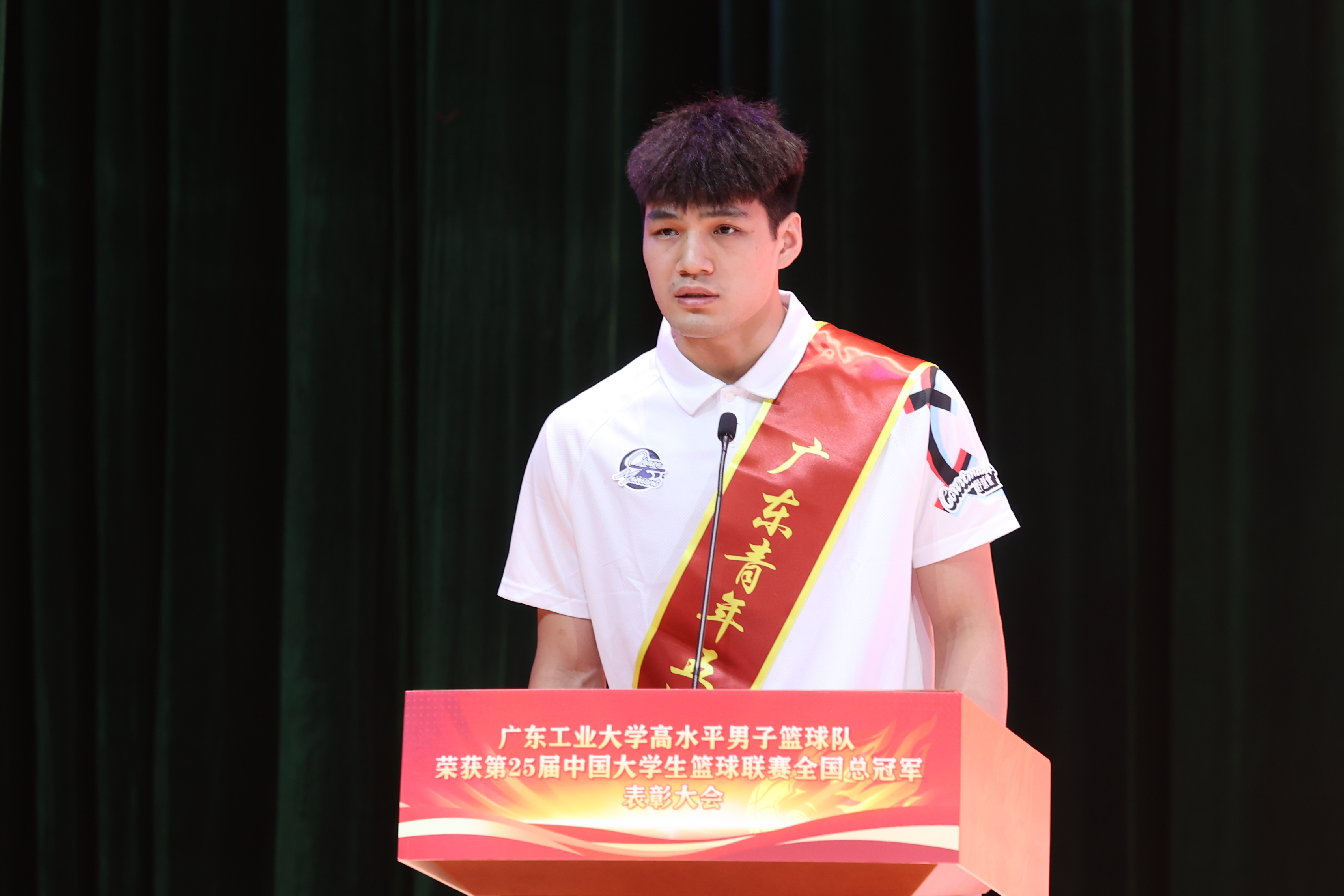 不仅是于广龙,这也是一场广工与陈国豪的双向奔赴。“与其说是我选择广工,不如说是广工发掘了我、培养了我,给了我一个施展身手的大平台。”球员代表陈国豪回望大学四年生活,感谢老师、教练、队友们的支持和帮助,大家的共同努力,成就了他的无悔青春。在他看来,唯有“奋斗”“拼搏”才能成就梦想。“有信念、有梦想、有奋斗、有奉献的人生,才是有意义的人生。”作为主力球员,他要加紧备赛刻苦训练,带领球队获得好成绩;作为学生,也要坚持上课学习提升自我。皇天不负苦心人,团队拿到了总冠军,他也顺利保送广工管理学院继续攻读硕士研究生。