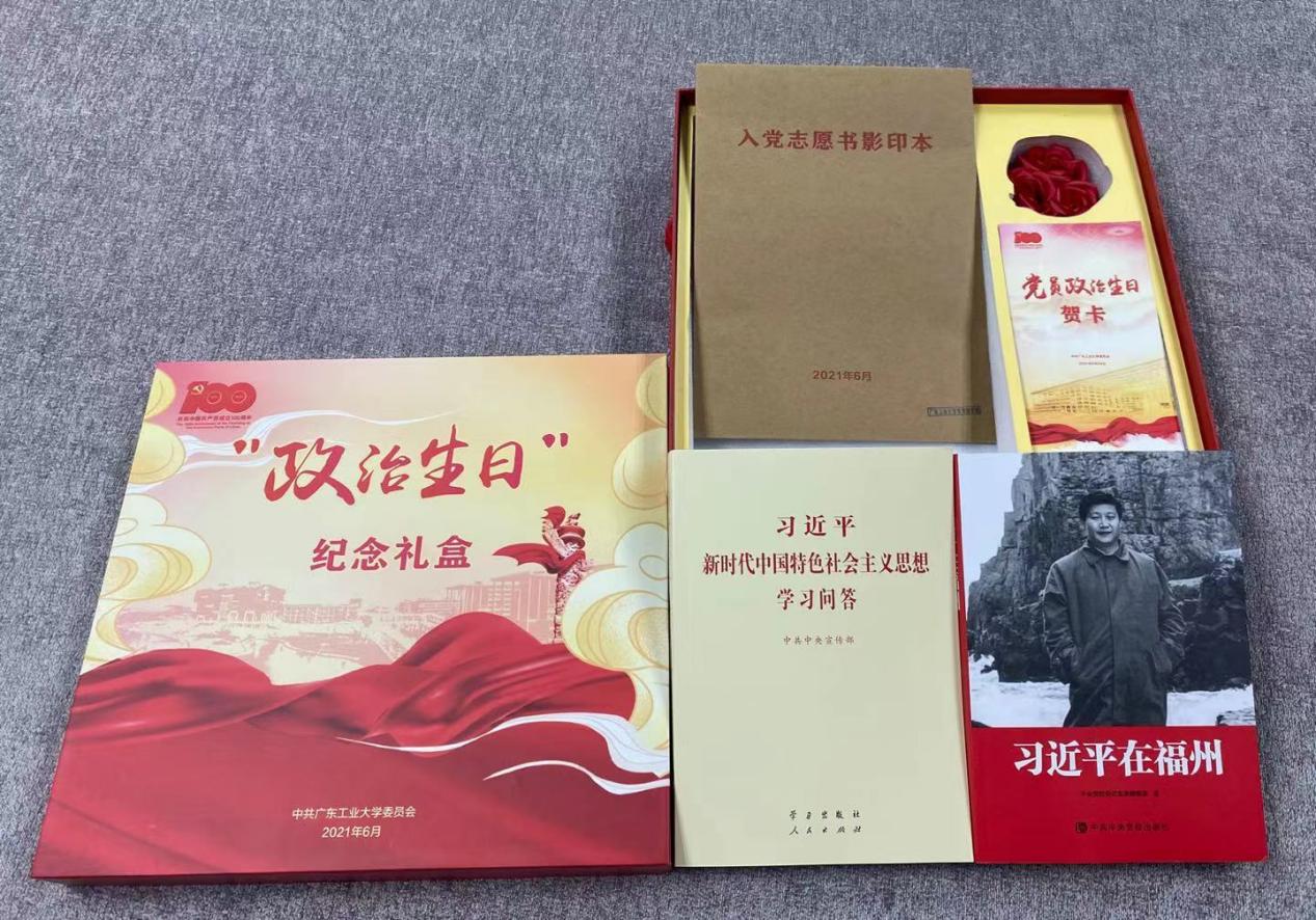 礼盒由“政治生日”贺卡、《习近平新时代中国特色社会主义思想学习问答》《习近平在福州》两本书籍以及《入党志愿书影印本》组成,表达了学校党委对党员“政治生日”的祝福,寄托了对党员坚守初心、终身学习、接续奋斗、永葆政治本色的殷切期望。
