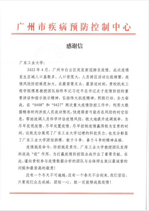 张周斌代表广州市疾控中心专程向我校送来感谢信。今年4月,面对“0408”和“0427”两次重大疫情防控工作,机电工程学院傅惠教授团队与广州市疾控中心精诚合作,日夜奋战,利用大数据精准研判涉疫人员流动情况,快速筛查可能存在风险的时空信息,帮助流调人员科学评估疫情风险,极大地提升流调效率,为尽早发现疫情、尽早处置疫情、尽早控制疫情赢得极为宝贵的时间,切实发挥科技战“疫”支撑作用,为打赢疫情防控阻击战作出突出贡献。