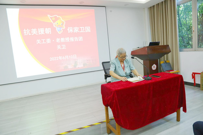 关卫1933年出生于佛山南海,在上海长大。解放战争中隶属于中国人民解放军第三野战军第九兵团。抗美援朝战争爆发后她作为第一批中国人民志愿军战士奔赴朝鲜战场,参加了战况极其激烈的长津湖战役,荣立三等功两次。上世纪80年代初任教于华体会·官方版网站登录入口社科部。她饱含感情地讲述了自己在抗美援朝战争中的经历。在党的培养和领导下,当时只有17岁的她在朝鲜战场克服了重重困难,坚决把本职工作做好。在部队中,共产党员总是处处做表率。在后勤补给困难的时候,共产党员带头让出自己的一份口粮,让年轻的小战士先吃。在战斗间隙,共产党员利用休息时间带领战士们学文化。在战斗中,她亲眼目睹身边的战友在共产党员的带领下发起一次又一次冲锋。在最艰难的时刻,都是共产党员率先站出来参加突击战斗。为了党和人民的利益,她身边有很多优秀的共产党员献出了宝贵的生命。说到动情处,关卫哽咽了,眼里闪烁着晶莹的泪花。最后,关卫对同学们提出三点期望:一是要坚定理想信念,牢记党的初心使命;二是要涵养家国情怀,勇担时代责任;三是要有不惧艰难勇向前、顽强拼搏敢争先的勇气。
