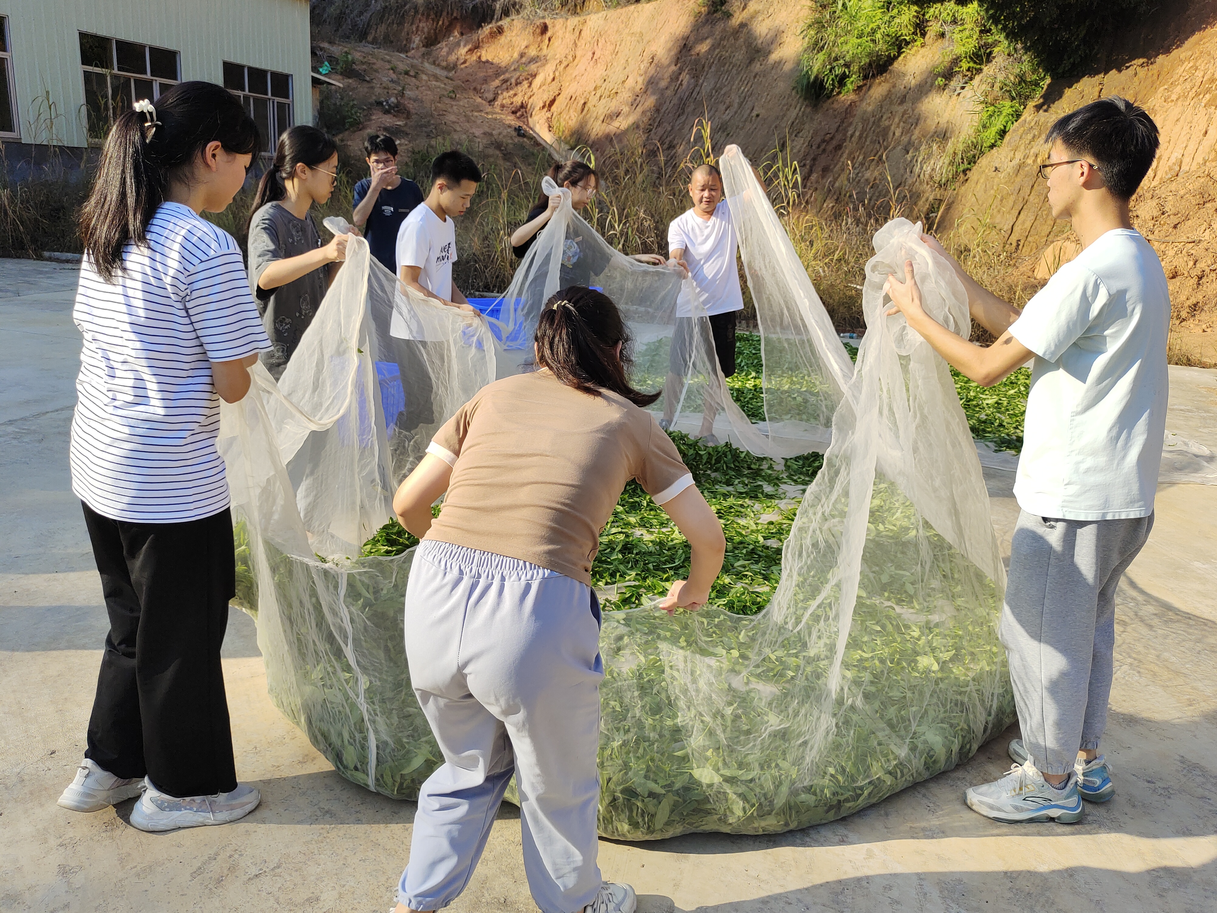 兴宁市径南镇是我校对口帮扶点,刚入径南,实践队一行人就同茶叶代表、扶村工作队及当地政府就径南茶产业的技术资源和产业优势进行了深入交流。实践队走进各村的制茶作坊,体验了晾青、晒青、摇青、发酵、杀青、揉捻和烘焙的制茶全过程,感受径南单丛茶悠久的历史文化与独特魅力。