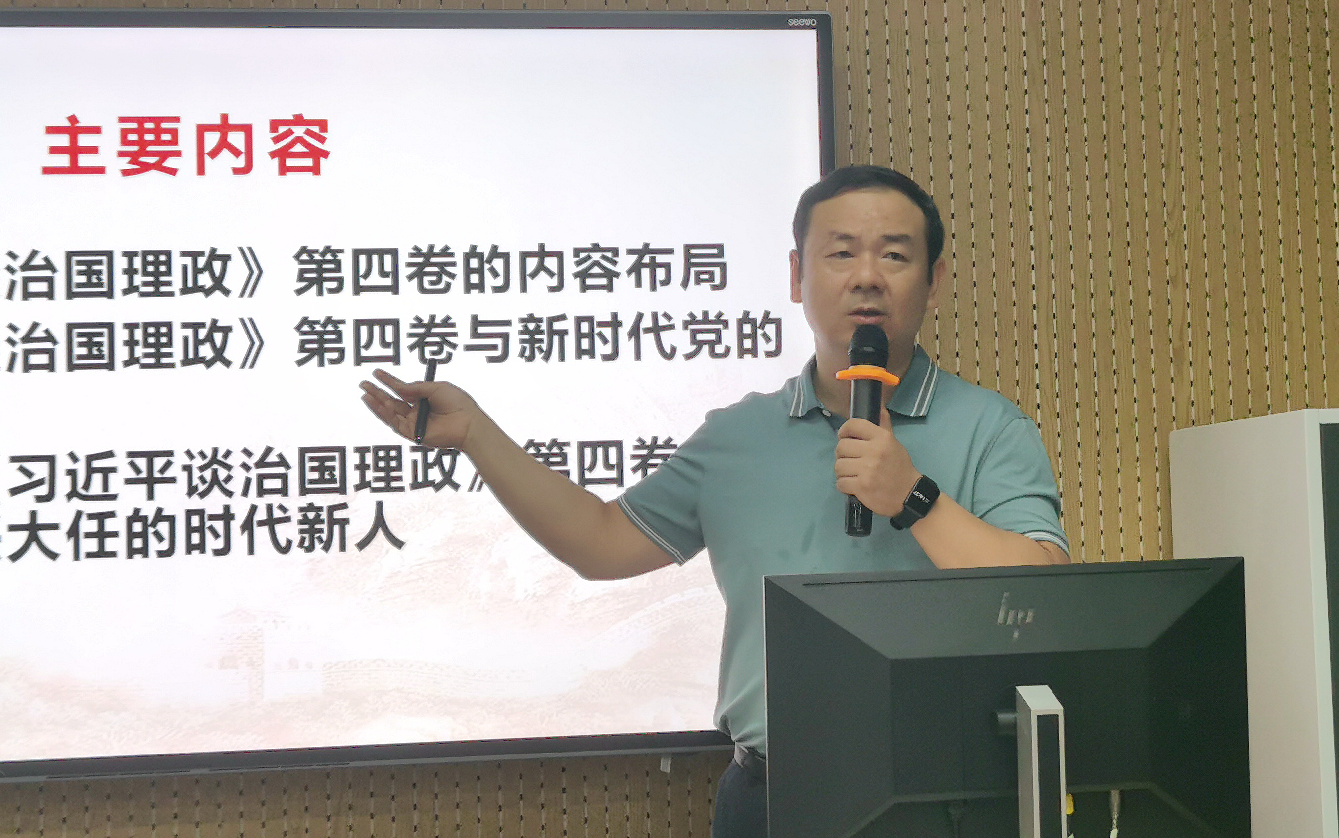 学校马克思主义学院副院长陈位志教授受邀作专题辅导报告。陈位志从《习近平谈治国理政》第四卷的理论定位、理论主线、理论概括和理论意义四个方面,点面结合带领大家梳理了全书的内容布局和基本框架,从历史维度、价值尺度和实践向度上,深化学习了习近平新时代中国特色社会主义思想所蕴含的马克思主义世界观和方法论,以及在回应重大时代课题中应运而生和丰富发展的清晰脉络;结合新时代党的青年观,对学生党员学懂弄通用好第四卷,培养爱国情怀、社会责任感、创新精神和实践能力,争做堪当民族复兴重任的时代新人提出了要求,指明了路径。