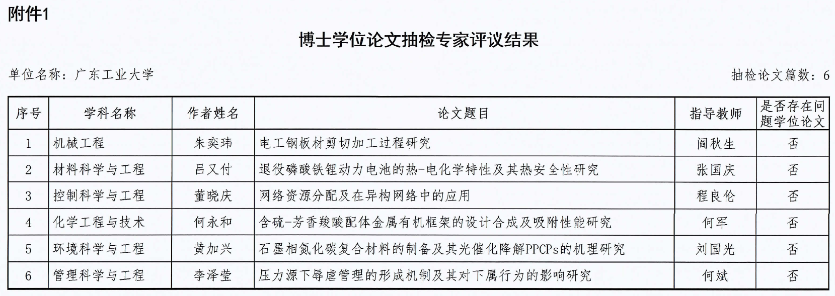 接国务院教育督导委员会办公室《关于反馈博士学位论文抽检专家评议结果的通知》(国教督办函〔2022〕32号),广工2019~2020学年度授予博士学位的学位论文被随机抽检6篇(附后),未发现“存在问题学位论文”。这是国务院学位委员会、教育部自2010年实施博士学位论文抽检工作起,学校被抽检博士学位论文连续十三年全部通过,合格率为100%。