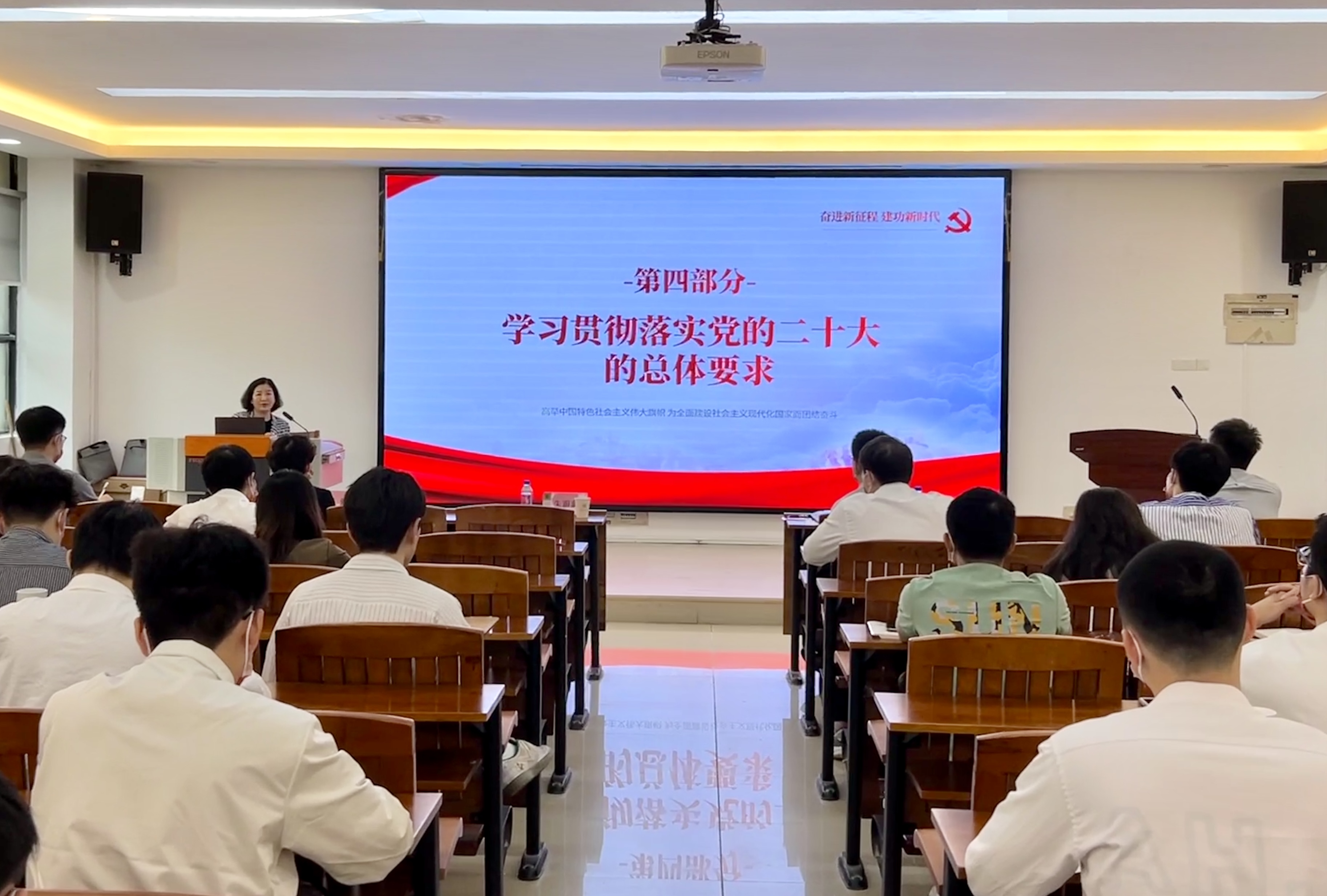 朱蔚蔚从党的二十大会议概况、深刻认识党的二十大的重大意义、深刻理解党的二十大的主要内容与核心要义、学习贯彻落实党的二十大的总体要求等方面进行领学,重点领学了党的过去五年的工作和新时代十年的伟大变革、中国式现代化的中国特色和本质要求等,并结合学校高水平大学建设分享了党的二十大精神中教育科技人才方面的论述。最后,朱蔚蔚要求全体党员要在全面学习、全面把握、全面落实上下功夫,勉励学生党员争做新时代有理想、敢担当、能吃苦、肯奋斗的好青年。