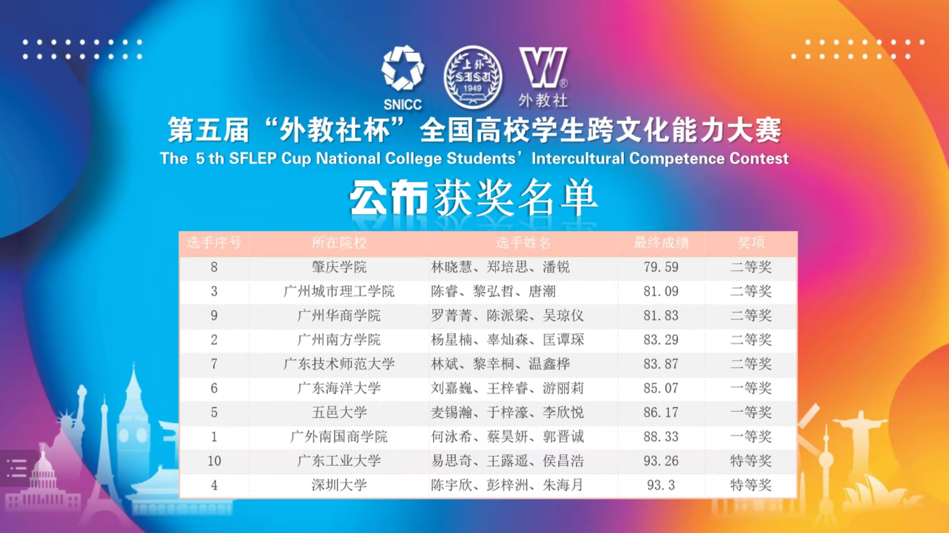 本次比赛自9月份启动以来,得到省内各高校的积极响应与参与,吸引了全省共40所院校120名学生参赛。大赛从案例开发、案例展示、案例分析和创新意识四大方面,全面考察选手在语言综合应用能力、跨文化交际敏感度与适应性,以及在多元文化情境中解决问题的创新能力。经过校赛、省复赛层层选拔,最终遴选出排名前10的队伍晋级决赛。经过精彩激烈的角逐,广工参赛队伍(指导老师:孙文娟、谢帆、尚康康)荣获特等奖(大赛第二名),获得全国总决赛参赛资格。