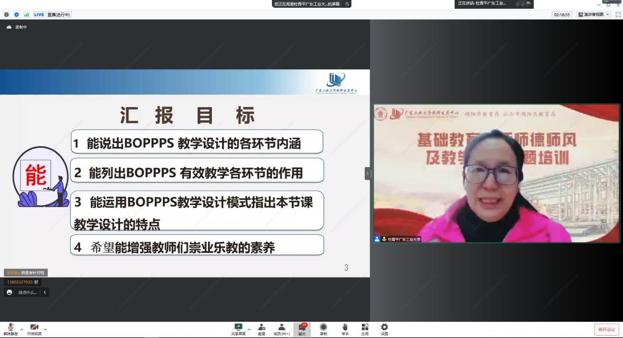 12月20日,为进一步促进我校帮扶基础教育高质量发展工作深入开展并取得更大实效,教师发展中心结合学校学术研究和师资培训资源优势,精准对接揭阳市和汕头市潮阳区基础教育发展需求,联合两地教育局,以腾讯会议线上直播方式共同举办基础教育教师师德师风及教学技能专题培训。我校物理与光电工程学院教授李晓端和生态环境与资源学院教授杜青平应邀作了专题报告。揭阳市和汕头市潮阳区的中小学教师共计1000余人参加了培训。
