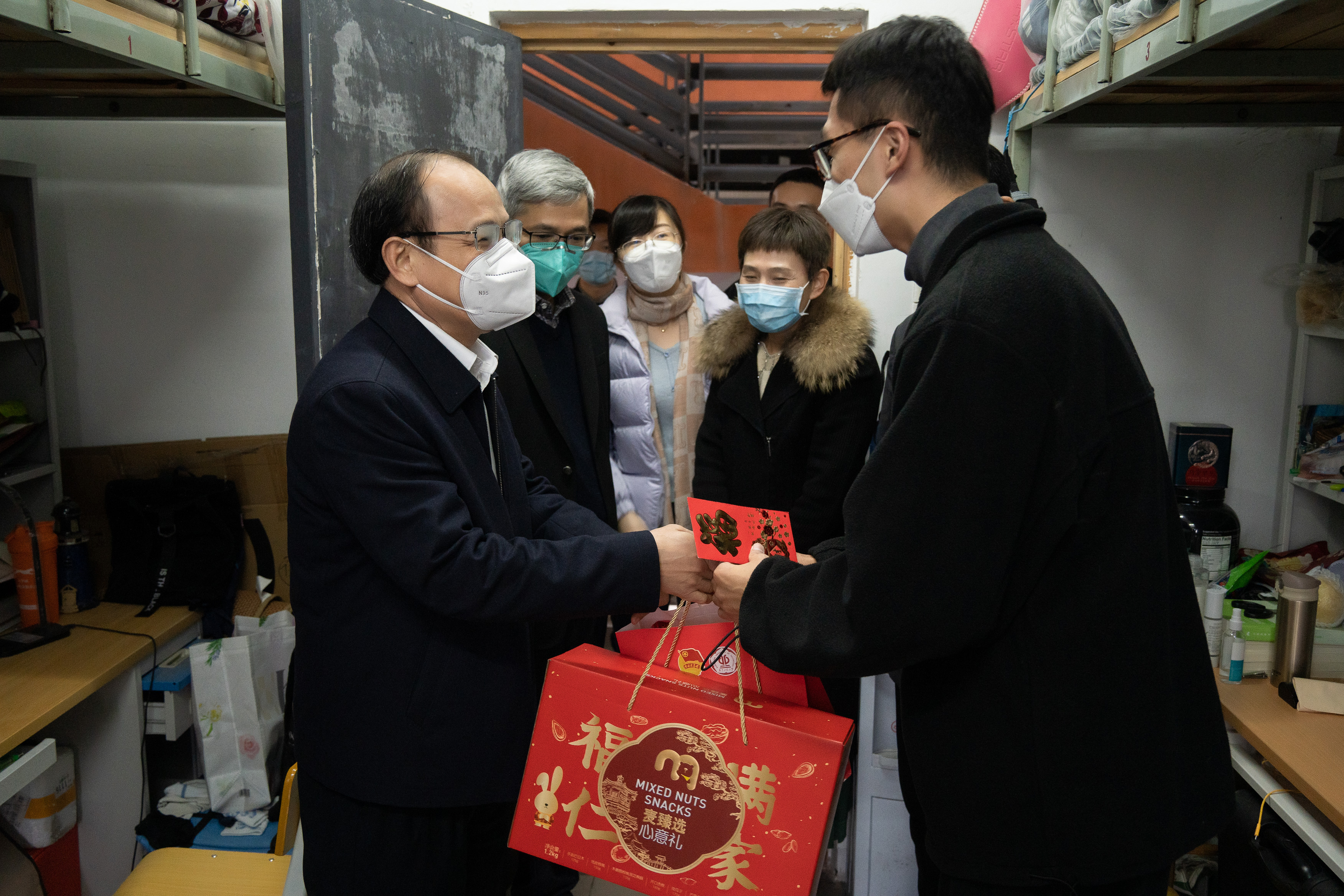 “遇到什么困难和问题,要及时反馈。”“同学们要合理规划假期时间,充实自己。”在学生社区,胡钦太、邱学青看望了寒假留校学生代表,询问同学们留校期间的科研安排与时间计划,提醒他们注意出行安全。勉励同学们充分利用好假期时段学习充实自己,适度锻炼的同时做好个人防护。并代表学校向同学们送上新春慰问礼包,祝福大家兔年新春快乐。在少数民族学生教育管理办公室、医院等单位、部门,校领导慰问了少数民族学生辅导员老师、医务工作人员等,嘱咐他们遇到什么困难与问题要及时反馈,并致以亲切关怀与新春祝福。