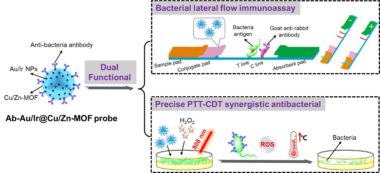 金黄色葡萄球菌(S. aureus)是对公共卫生最普遍的威胁之一,对其进行高灵敏度的快速检测和精准的杀灭对于遏制其传播至关重要。为此,在本研究中我们首先制备了一种由双金属纳米粒子和金属有机骨架组成的纳米复合材料(Au/Ir@Cu/Zn-MOF)。然后将其与抗金黄色葡萄球菌抗体偶联构建了既可作为横向流动免疫测定(LFIA)报告探针,又可作为高效抗菌试剂的Ab-Au/Ir@Cu/Zn-MOF纳米复合材料。得益于Cu/Zn-MOF对Au/Ir NPs的富集作用,基于Ab-Au/Ir@Cu/Zn-MOF的LFIA传感器对S. aureus的视觉检测限(LOD)达到了103 CFU/mL,比基于Ab-Au/Ir的LIFA传感器灵敏100倍。 此外,Ab-Au/Ir@Cu/Zn-MOF还具有精准协同光热-化学动力学杀菌作用,在低至6.25 μg/mL的浓度下即可实现5×105 ~ 106 CFU/mL金黄色葡萄球菌的完全灭菌。通过改变抗体,这种纳米复合材料可以针对多种细菌进行定制,用于快速灵敏检测和精准抗菌治疗。