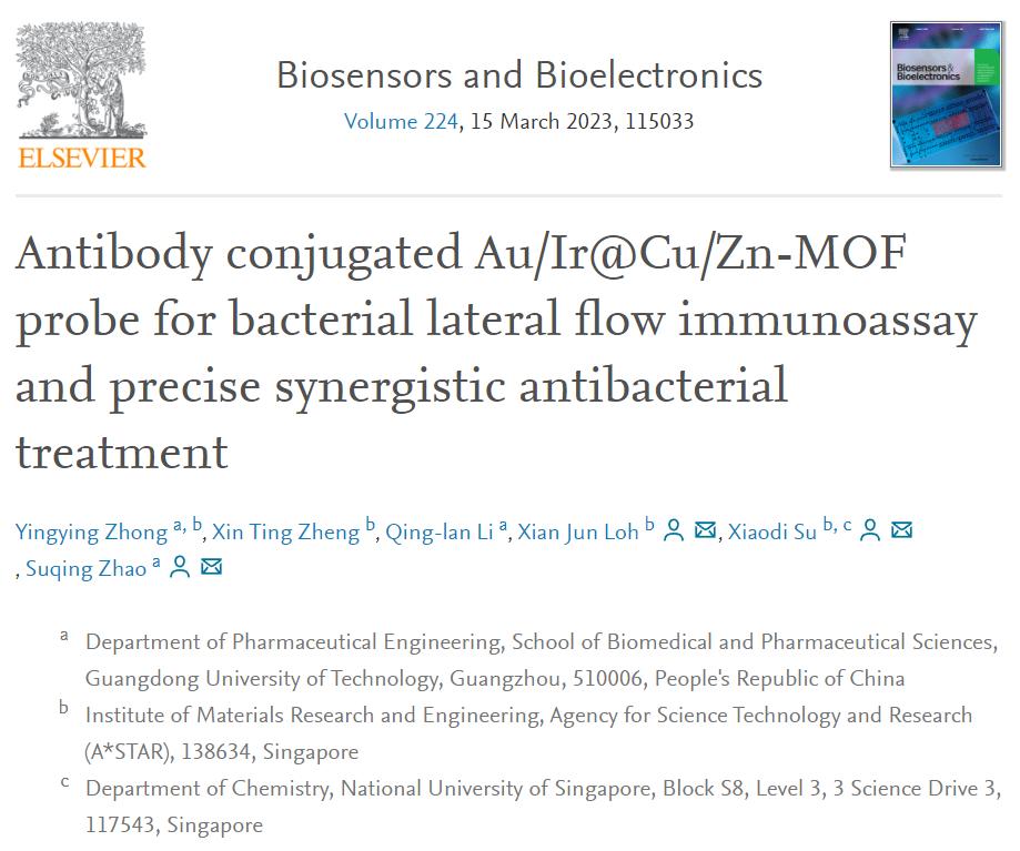 学校生物医药学院赵肃清教授团队最新研究成果“Antibody conjugated Au/Ir@Cu/Zn-MOF probe for bacterial lateral flow immunoassay and precise synergistic antibacterial treatment”被国际生物传感器领域顶级学术期刊Biosensors and Bioelectronics发表。该期刊为生化分析及传感器领域TOP期刊,2021-2022年度最新影响因子为12.545,CiteScore为20.20,在全球同类SCI学术期刊中长期排名第一。该论文华体会·官方版网站登录入口为第一完成单位,赵肃清教授和Su Xiaodi为通讯作者,博士研究生钟颖颖为第一作者,论文DOI: 10.1016/j.bios.2022.115033。