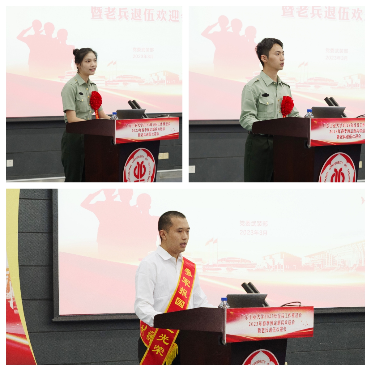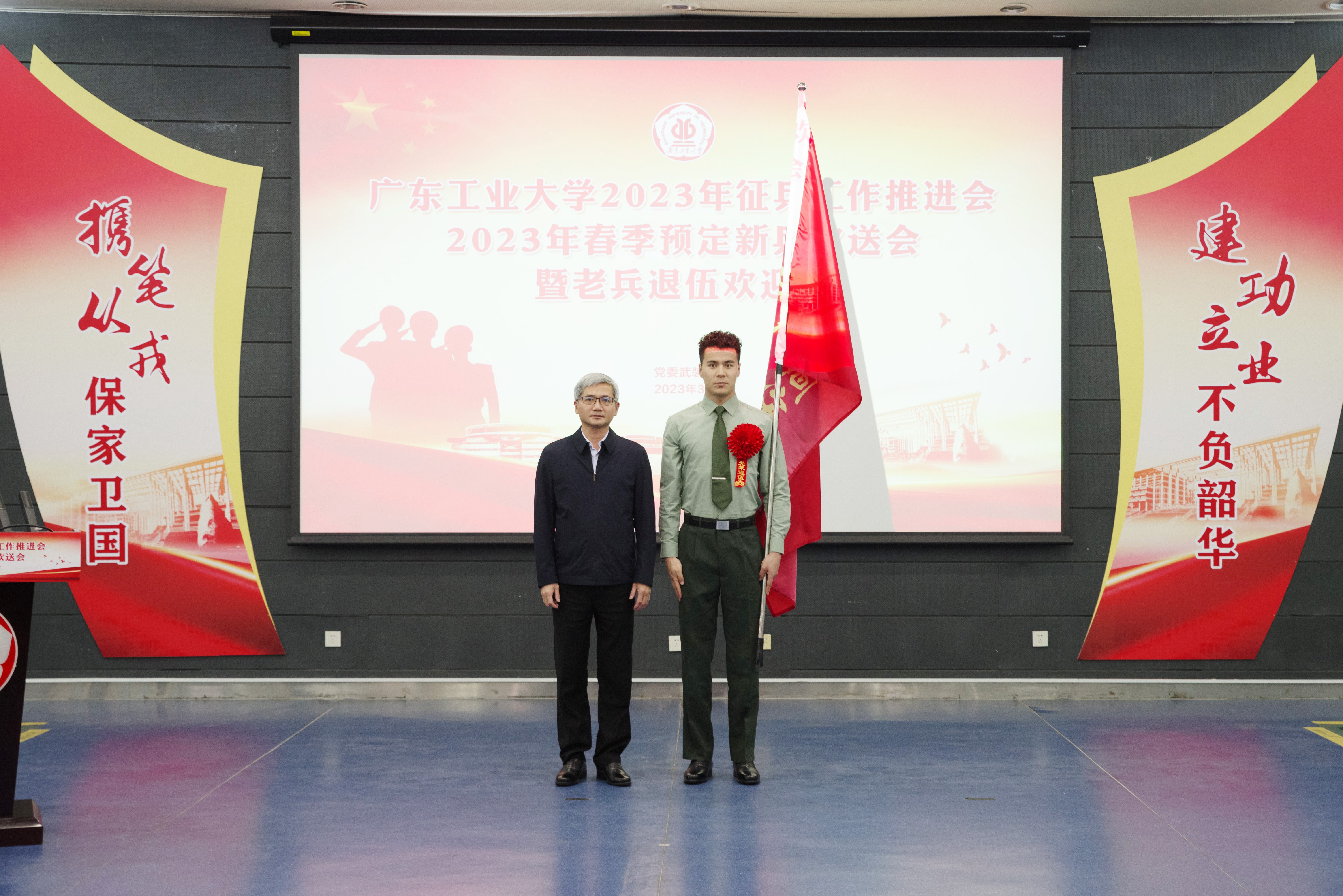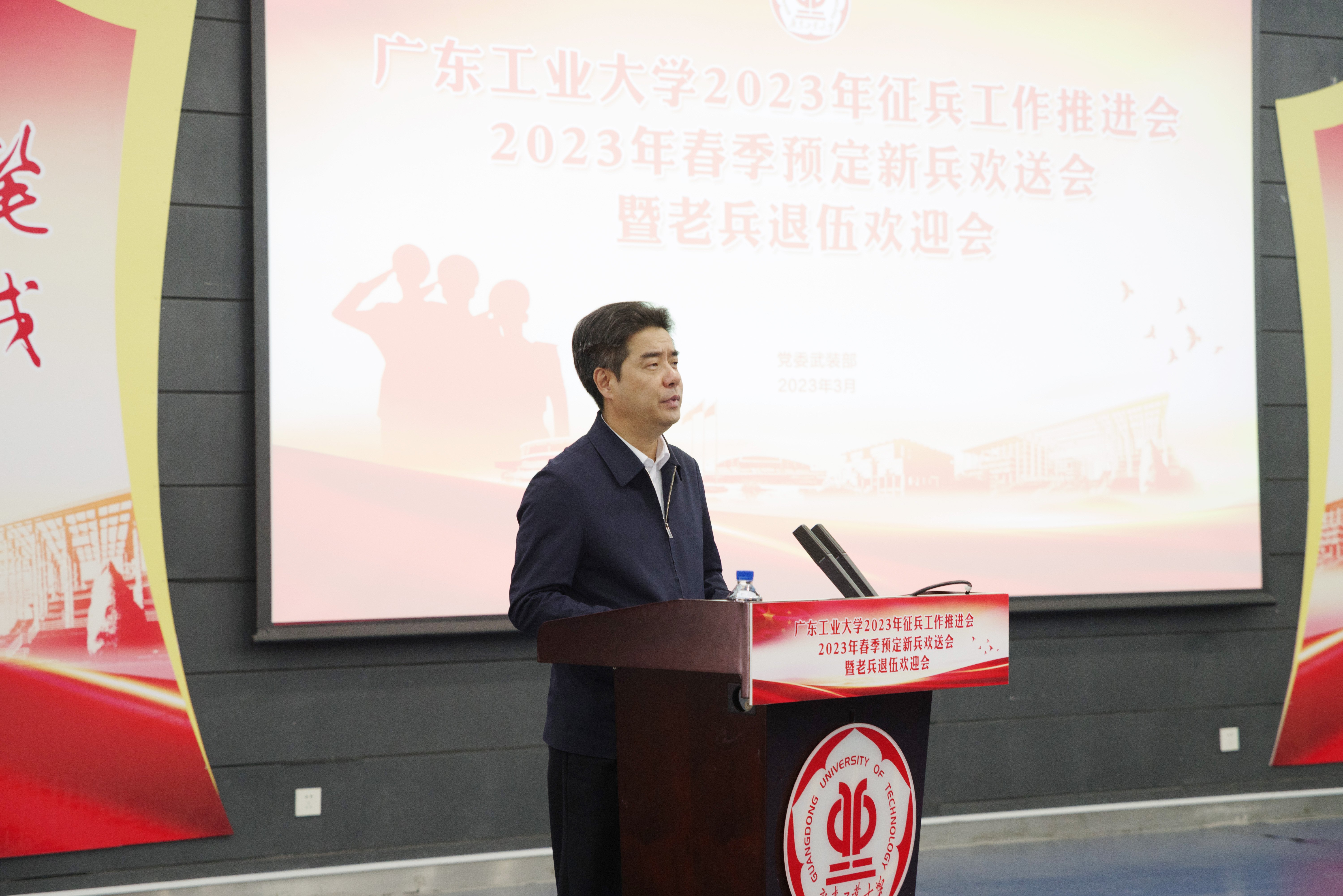 胡钦太代表学校党委向预定新兵表示衷心的祝贺,向退伍老兵表示热烈的欢迎!他指出,学校始终高度重视大学生征兵工作,将其作为服务国家发展战略、服务国防和军队现代化建设的光荣使命和政治任务,融入学校人才培养的全过程。他充分肯定预定新兵和退伍老兵携笔从戎、保家卫国的决心,赞扬广工学子的责任担当和家国情怀,并向全体参会人员提出三点希望和要求:一是希望即将入伍的新兵同学们传承红色基因,坚定理想信念,坚持学以致用,争做新时代专业化军事人才。要不负青春热血,将个人梦融入中国梦,在军队这个大舞台上施展才华,在军营这个大熔炉里淬炼成钢,书写绚烂无悔的青春篇章。二是希望退役复学的老兵同学们永葆军人本色,勇担时代使命,尽快转变角色,在校园实现人生新价值。将部队的好传统、好作风在大学校园继续发扬,展示军人的良好风貌,成为青年大学生学习的榜样。三是希望学校各单位部门进一步提高政治站位,强化责任担当,把握关键环节,为开创国防和军队现代化新局面贡献广工力量。要站在讲政治、顾大局的高度,进一步增强责任感和使命感,提高组织领导力,确保2023年征兵任务圆满完成。