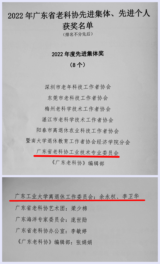 近日,广东省老科学技术工作者协会(以下简称“省老科协”)在广州召开第十三届八次理事会议,对2022年8个先进集体和47位先进个人进行表彰,学校关工委老教授报告团成员、省老科协工业技术专委会主任、广东省人民政府原参事、全国专业标准化委员会委员余永权教授受到表彰。其领导的工业技术专委会被老科协评为先进集体,其本人和李卫华教授一同被评为先进个人。