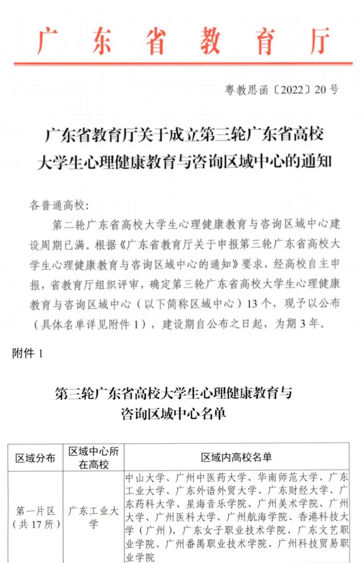 为推进我省高校大学生心理健康教育与咨询工作高质量发展与区域协同联动,省教育厅以地理就近为原则,将全省高校划分为13个片区,每个片区由一所心理健康教育工作示范性高校作为区域中心,牵头组织协调区域内高校的协同发展。广工2019年获批第一片区区域中心,三年多来,在学校领导的重视和关心下,心理健康教育中心充分发挥示范和辐射作用,通过召开工作会、研讨会,开展技能培训、教学大赛、案例督导等多种形式的活动,带领区域高校取得了优异的成绩。心理健康教育中心也紧紧围绕学校工作目标,秉承“助人自助”的工作宗旨,不断完善和发展心理健康教育与咨询工作体系,全面提高了学校大学生心理健康教育和咨询工作的品牌影响力,为全体学生的心理健康保驾护航。
