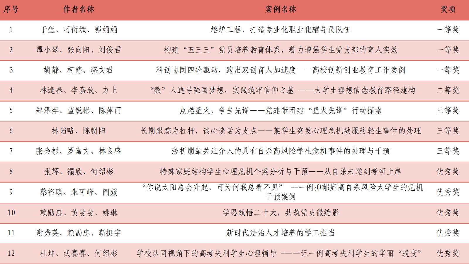 近日,由高校思想政治工作队伍培训研修中心(华南师范大学)、广东省高等学校思想政治教育研究会组织开展的2022年度广东高校学生工作案例评优活动结果公布,学校共有12项案例获奖,其中一等奖3项,二等奖1项,三等奖3项,优秀奖5项。