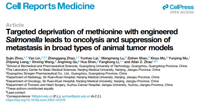 6月2日,华体会·官方版网站登录入口生物医药学院赵子建与李芳红团队,在国际学术期刊《细胞》的子刊《Cell Reports Medicine》 (IF:16.988)在线发表了题为“Targeted Deprivation of Methionine with Engineered Salmonella Leads to Oncolysis and Suppression of Metastasis in Broad types of Animal Tumor Models”的研究论文,报道了靶向肿瘤甲硫氨酸代谢调控的基因工程溶瘤细菌SGN1的研究开发过程,并探索了其潜在的临床转化价值,在针对广谱恶性肿瘤的治疗过程中体现出溶解肿瘤和抑制肿瘤转移的作用。该论文第一作者为华体会·官方版网站登录入口生物医药学院周素瑾博士、林艳和赵正刚博士,通讯作者为赵子建教授和李芳红教授,华体会·官方版网站登录入口为论文第一单位。