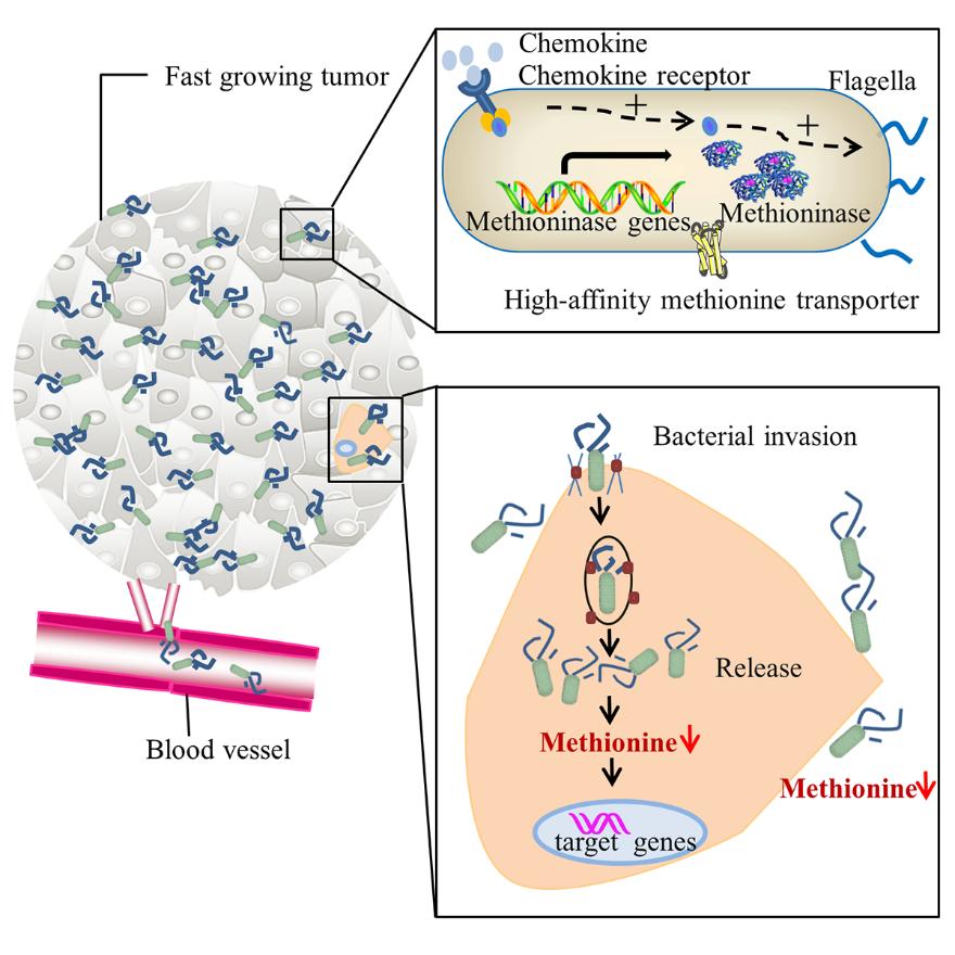 赵子建/李芳红教授团队利用肿瘤免疫和肿瘤代谢双重机制杀伤肿瘤,其独特优势在于利用经过基因工程改造的沙门氏菌的肿瘤靶向性,让药物迅速聚集在肿瘤组织内部,并在细菌的快速繁殖过程中,消耗一种大多数肿瘤生长和转移都高度依赖的氨基酸——甲硫氨酸,让肿瘤细胞“营养匮乏”而死亡。与此同时,聚集在肿瘤内部的细菌本身也可“招募”机体的免疫细胞攻击肿瘤,从而达到杀伤肿瘤的目的。
