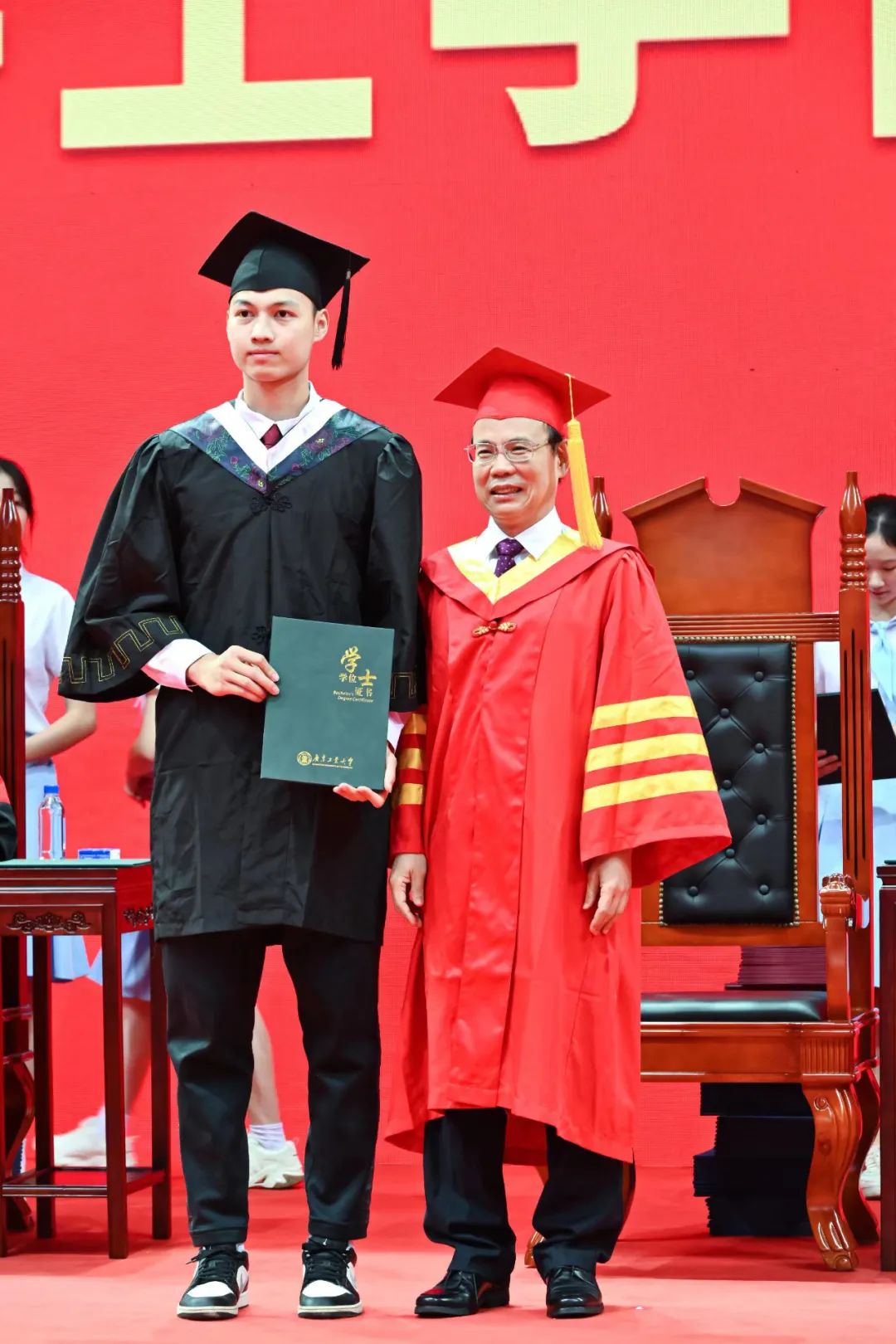 值得一提的是,今天参加仪式的毕业生中,有三位来自学校高水平男子篮球队,也是在刚刚结束的第25届中国大学生篮球一级联赛中勇夺全国总冠军的球员代表,他们分别是23号球员陈国豪、12号球员周泽源、15号球员刘康能。邱学青为他们授予学位,现场响起热烈的掌声和欢呼声。