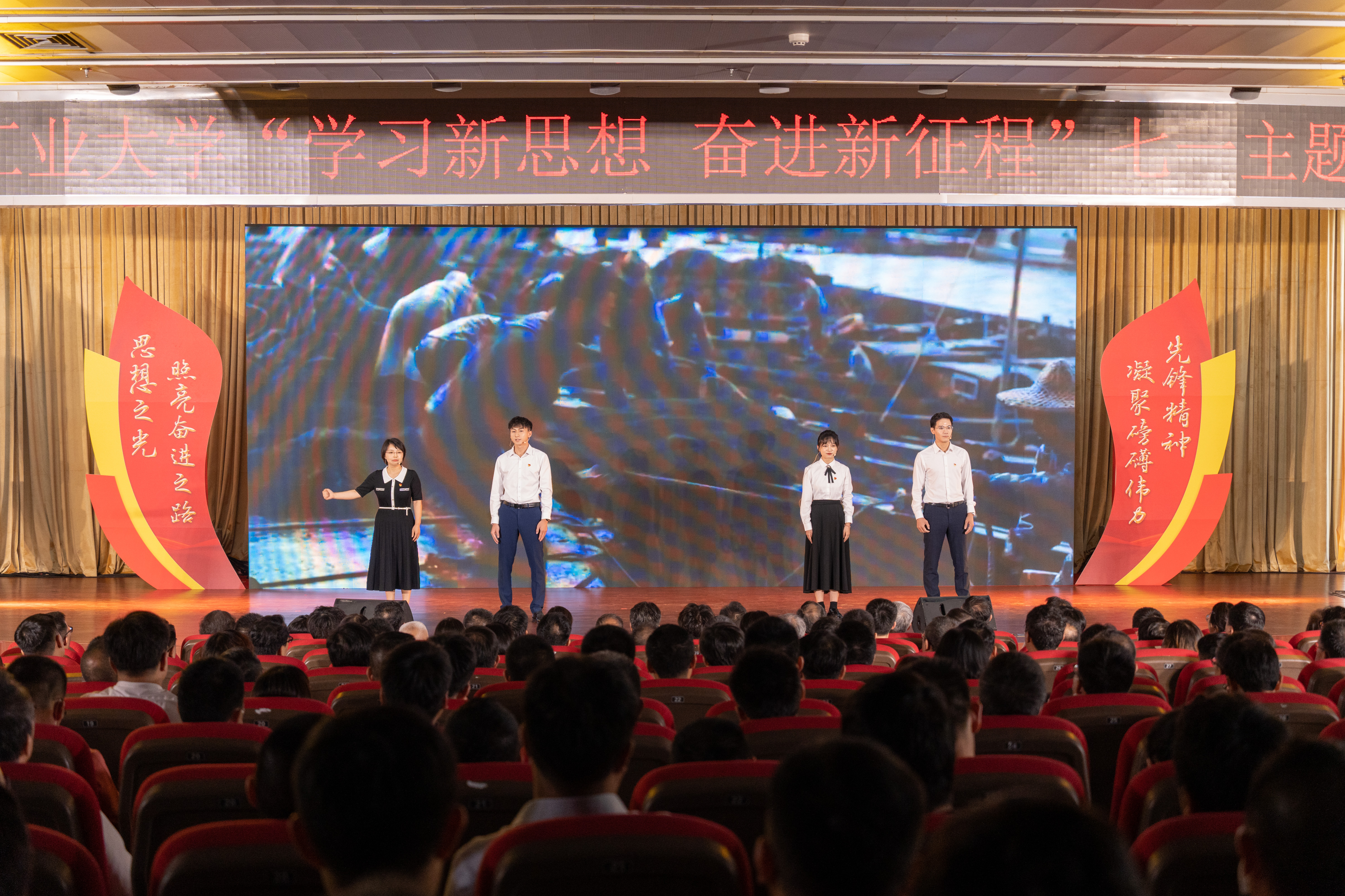 情景式微党课《思想之光照亮奋进之路》,教师党员李文华、林晓清,学生党员李嘉、林少炜,以习近平总书记这段话的思想精髓为主线,回溯百年党史,在历史的风云激荡、时代的沧桑变迁中,重温党的创新理论的一次次飞跃和党创造的一个又一个彪炳史册的光辉胜利;结合自身实际,从一个见证者的角度生动反映了新时代过去十年的伟大变革、过去五年的巨大成果,充分彰显了习近平新时代中国特色社会主义思想的真理力量;将广工作为思想之光引航中国的缩影和印证,动情讲述了广工本科办学65载,始终“与广东崛起共成长,为广东发展作贡献”,“扩规模、拓空间、上水平、攀高峰”的发展史,以及广工共产党人和广工人在新时代,全面贯彻落实习近平总书记视察广东重要讲话、重要指示精神,全力作答“建设什么样的广工,为广东提供什么样的支撑”时代答卷,大力弘扬信念坚定、对党忠诚、勇于担当、无私奉献的崇高品格,奋楫追光,奋勇逐梦,奋力攀撑的火热实践,表达了在强国建设、民族复兴的新征程上,“广工号”必将乘风破浪,用胜利续写新的荣光的豪情和决心。