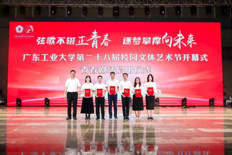 学校领导和校友代表、学生代表共同为第二十八届校园文体艺术节开幕和青春剧场启用推动启动杆