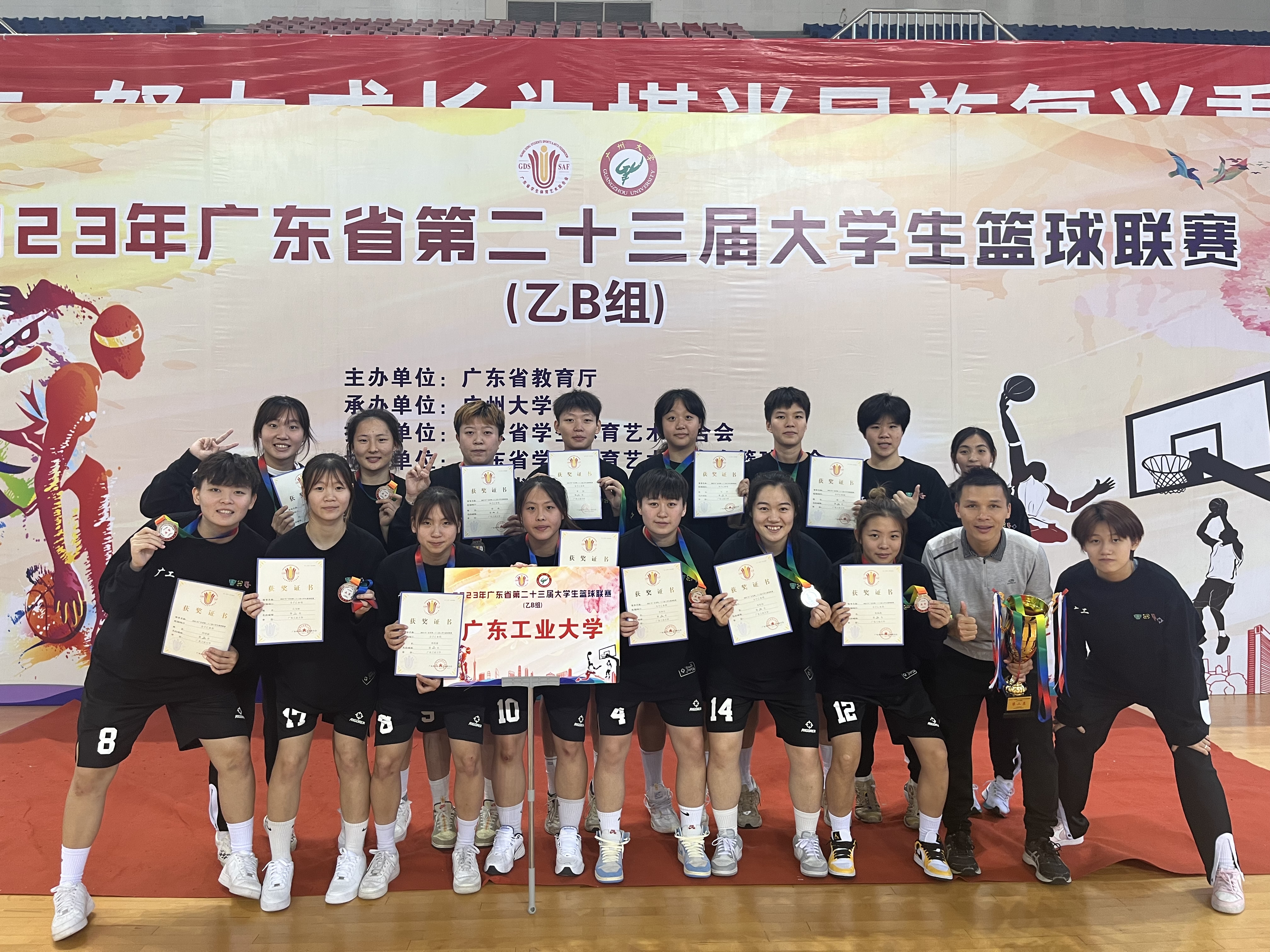 11月16日至23日,由广东省教育厅主办,广东省学生体育艺术联合会执行,广州大学承办的2023年广东省第二十三届大学生篮球联赛(乙B组)在广州大学何世杰体育馆举行,我校男子篮球队一路过关斩将,夺得冠军。