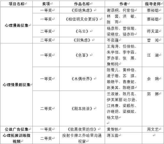 广东省教育厅于近日公布了2023 年“5·25”大学生心理健康教育月系列活动的评比结果,学校师生作品在“妙笔绘初心”心理漫画征集活动、“凝心剧力,悦动青春”心理情景剧征集活动、“悦享心时代”心理公益广告征集活动以及“逐梦心灵路”心理拓展训练微视频征集活动几个项目中取得佳绩。