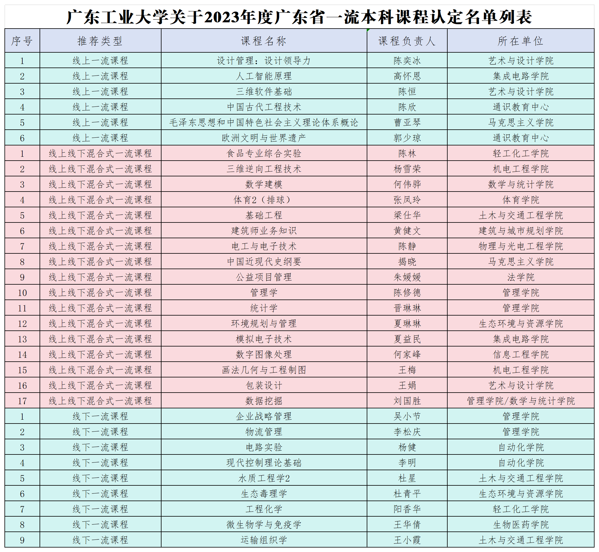 近日,广东省教育厅印发《广东省教育厅关于公布2023年度省级一流本科课程认定结果的通知》(粤教高函〔2023〕33号),广工《毛泽东思想和中国特色社会主义理论体系概论》等32门课程获认定为省级一流本科课程,包括线上课程6门,线上线下混合式17门,线下课程9门。截至目前,学校共有国家级一流本科课程21门,省级一流本科课程123门。
