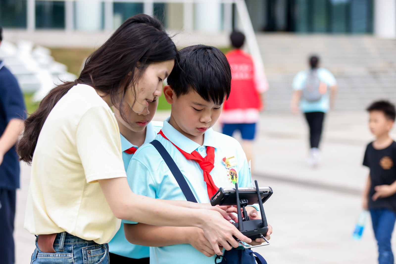 在文化活动中心前,无人机的飞行体验也让同学们兴奋不已。在广工创新创业学院无人机团队的哥哥姐姐们指导下,孩子们亲手操控无人机,时而攀升高空,时而低飞掠过,现场阵阵惊呼。陈芷萱同学说:“我们学习了无人机操控的基本技巧,也了解到无人机并不仅仅是应用于日常摄影摄像,例如,在自然灾害发生时无人机可以迅速抵达险区,提供实时的高清图像,协助救援人员更好地进行救援工作等。”