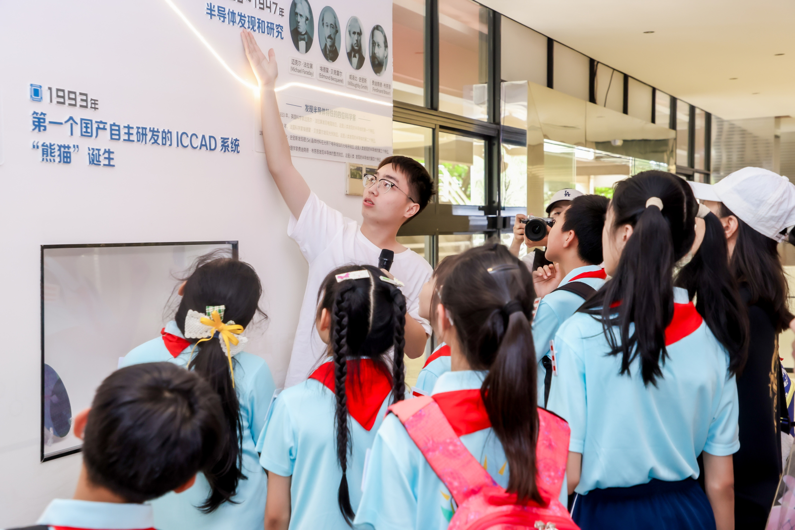 在集成电路认知体验馆,讲解员用通俗易懂的科普为同学们讲解“高精尖”技术,带领大家了解了芯片的基本知识和应用,学习了集成电路在技术实现、技术创新方面的呈现,以及集成电路产业的发展历程。“芯片分布在小小的圆盘上。没想到,这样的芯片藏在我们的电话手表等各类电子设备中,与我们的生活如此息息相关!”陈浩睿同学兴奋地说。集成电路认知科普课堂不仅引导孩子们学习理解了芯片的相关知识,还大大激发了他们对集成电路行业的兴趣,在孩子们的心中种下了创“芯”的种子。