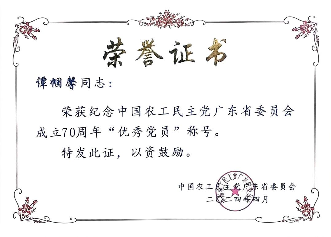 会上,对在各项工作中作出突出成绩的农工党广东省69个优秀组织、150名优秀农工党党员、40名优秀党务工作者、125个先进集体、235名先进个人进行了表彰。农工党广工大支部荣获“先进基层组织”称号,支部委员谭帼馨教授荣获“优秀党员”称号。