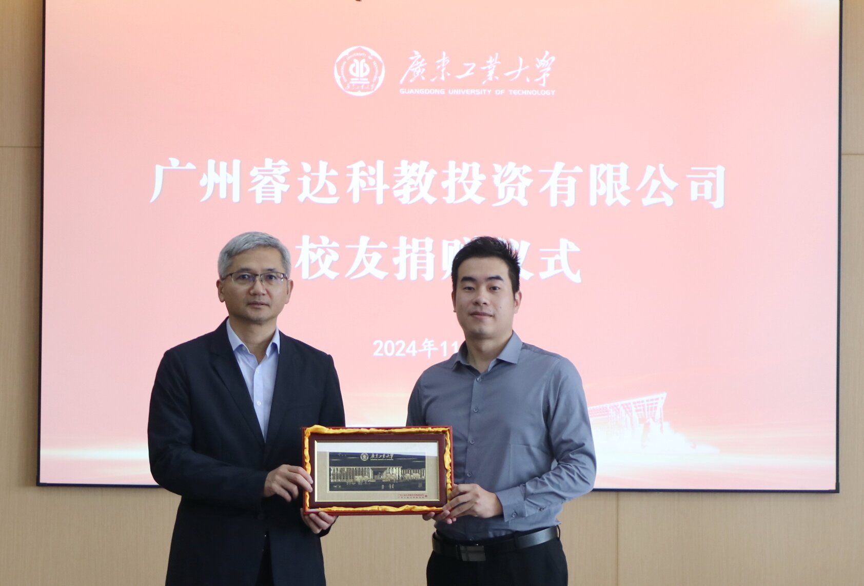 近日,学校在行政楼702会议室举行广州睿达科教投资有限公司校友捐赠仪式。学校党委副书记、校友会会长陈卓武出席仪式,党委学生工作部、对外联络与校友事务办公室负责同志及相关人员,广工校友、广州睿达科教投资有限公司总经理黎耀煜和副总经理陈健浩参加活动。