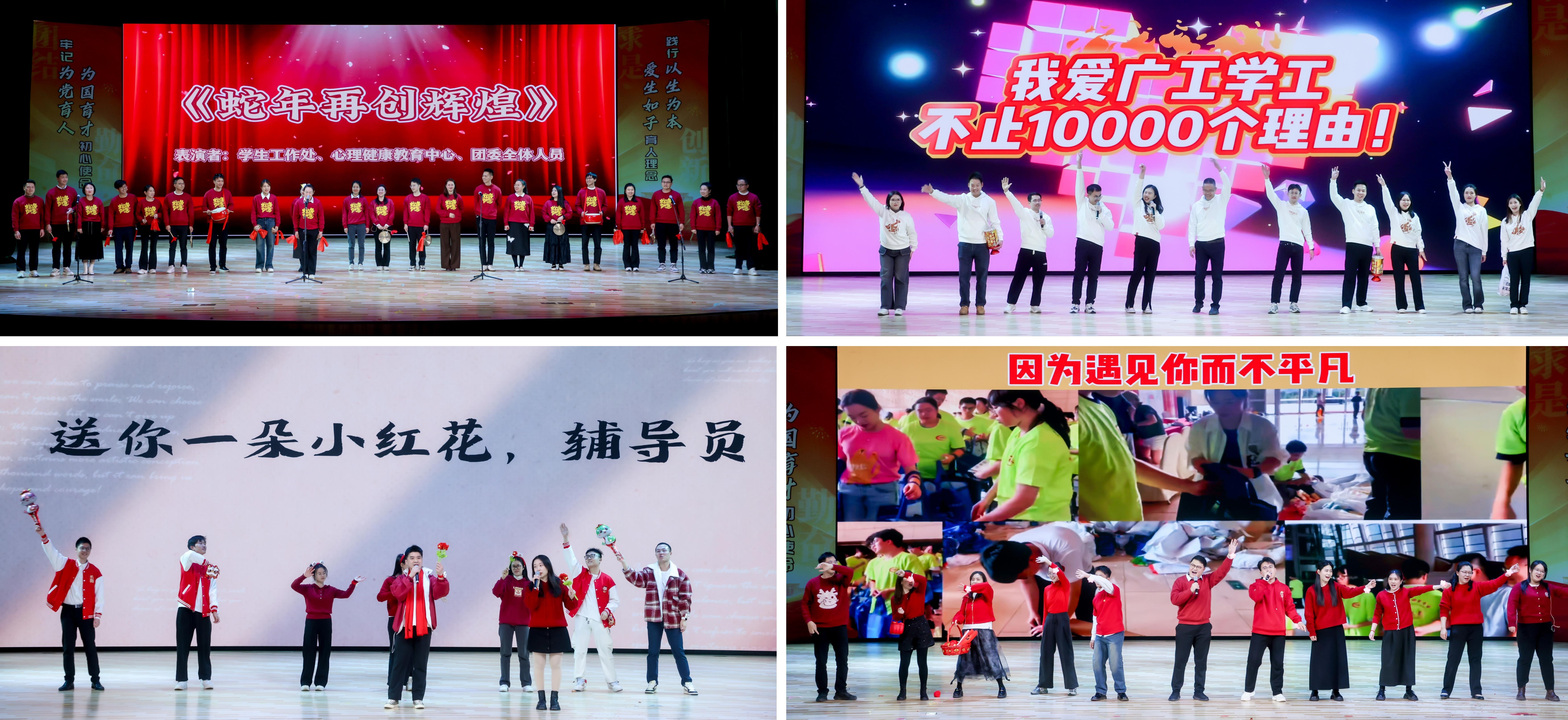 在学工干部风采展示环节,学工部、心理中心、校团委以及各学院学工干部围绕学工人的工作日常,通过诗朗诵、改编歌曲、情景短剧、创意讲述等表现形式,讲述育人故事、诠释使命担当、回顾奋斗岁月、畅想新的希望,老师们情真意切的表达抒发、各具特色的才艺展示博得阵阵掌声,现场气氛热烈、欢笑不断。