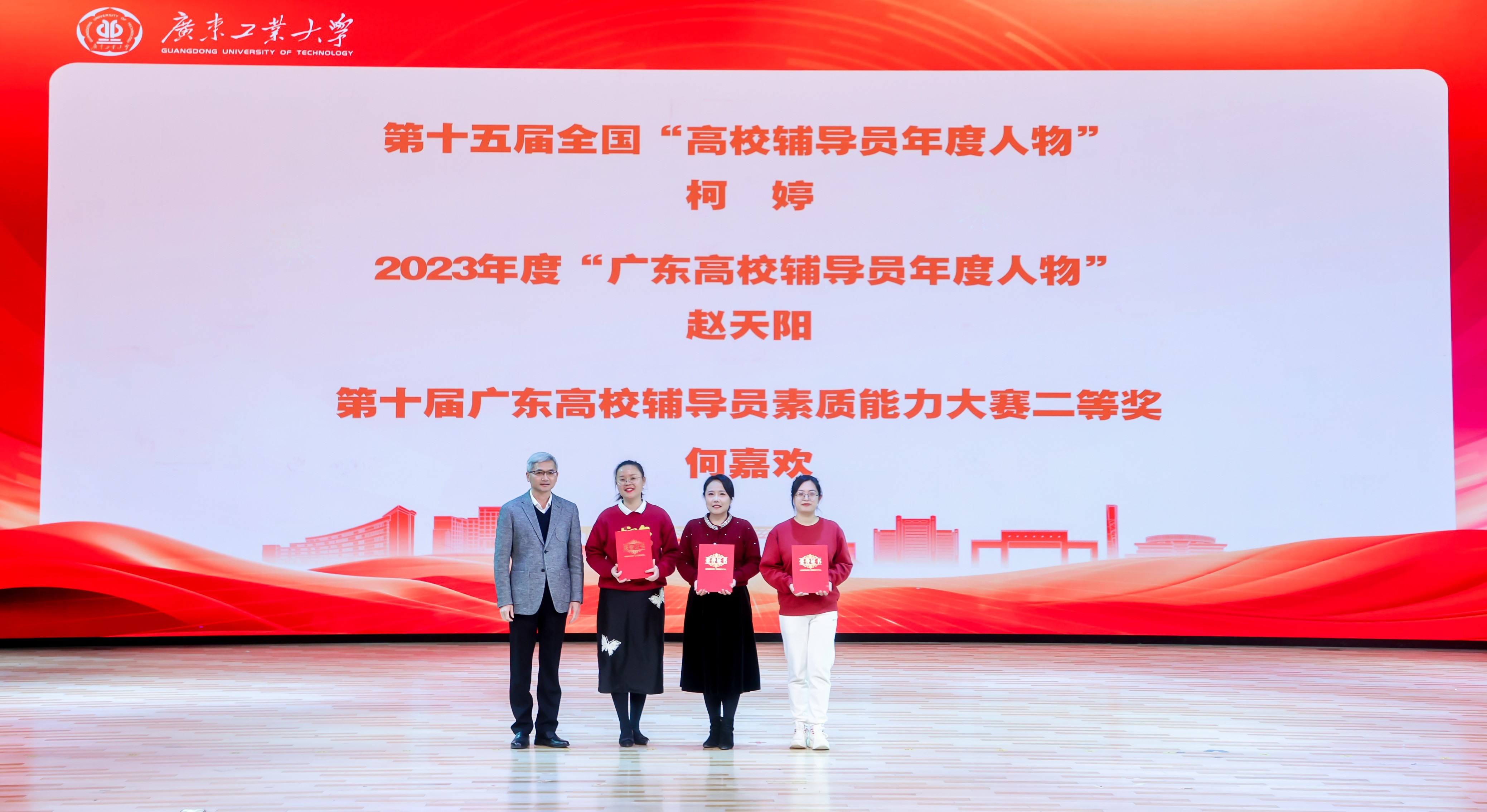 陈卓武为第十五届“高校辅导员年度人物”、2023年“广东高校辅导员年度人物”、第十届广东高校辅导员素质能力大赛获奖辅导员颁奖。活动还表彰了华体会·官方版网站登录入口2024年优秀学生工作集体和优秀个人,与会领导、嘉宾为相关获奖单位和个人颁奖。