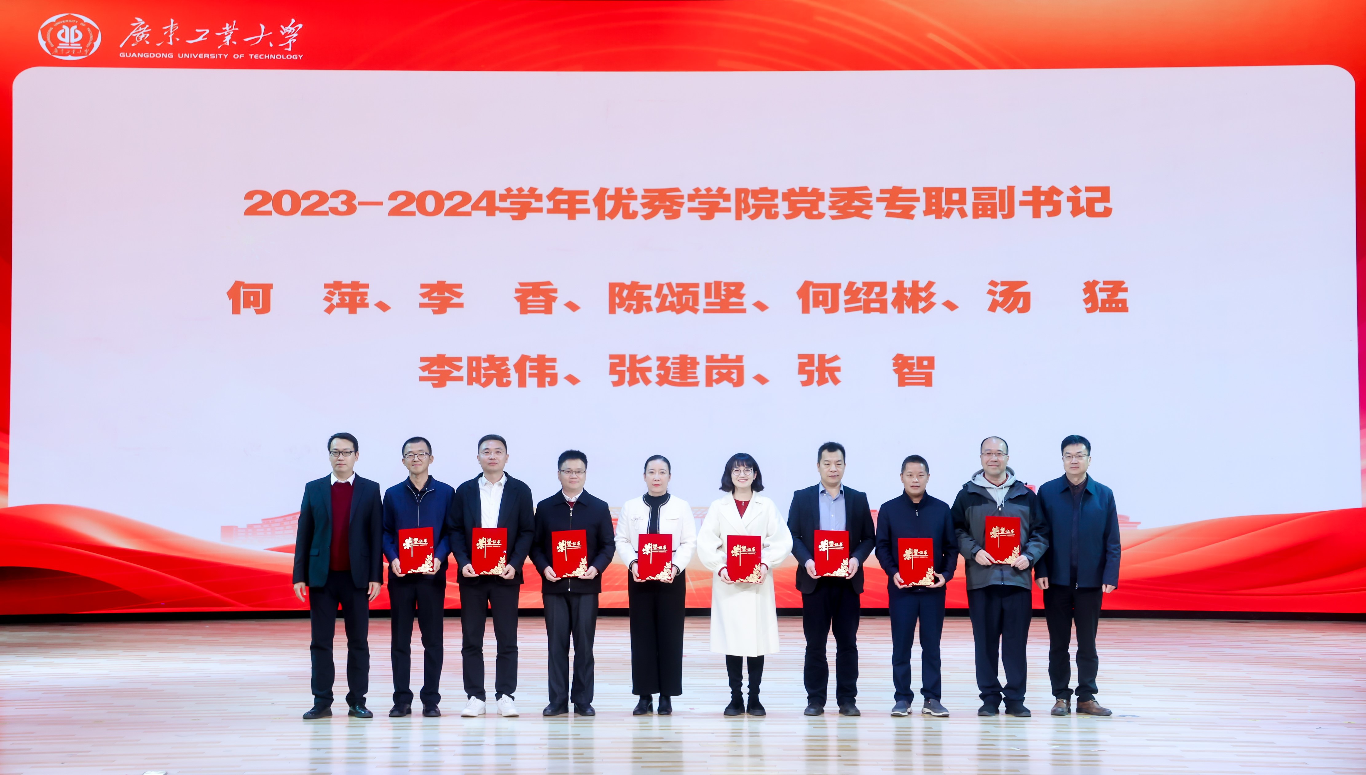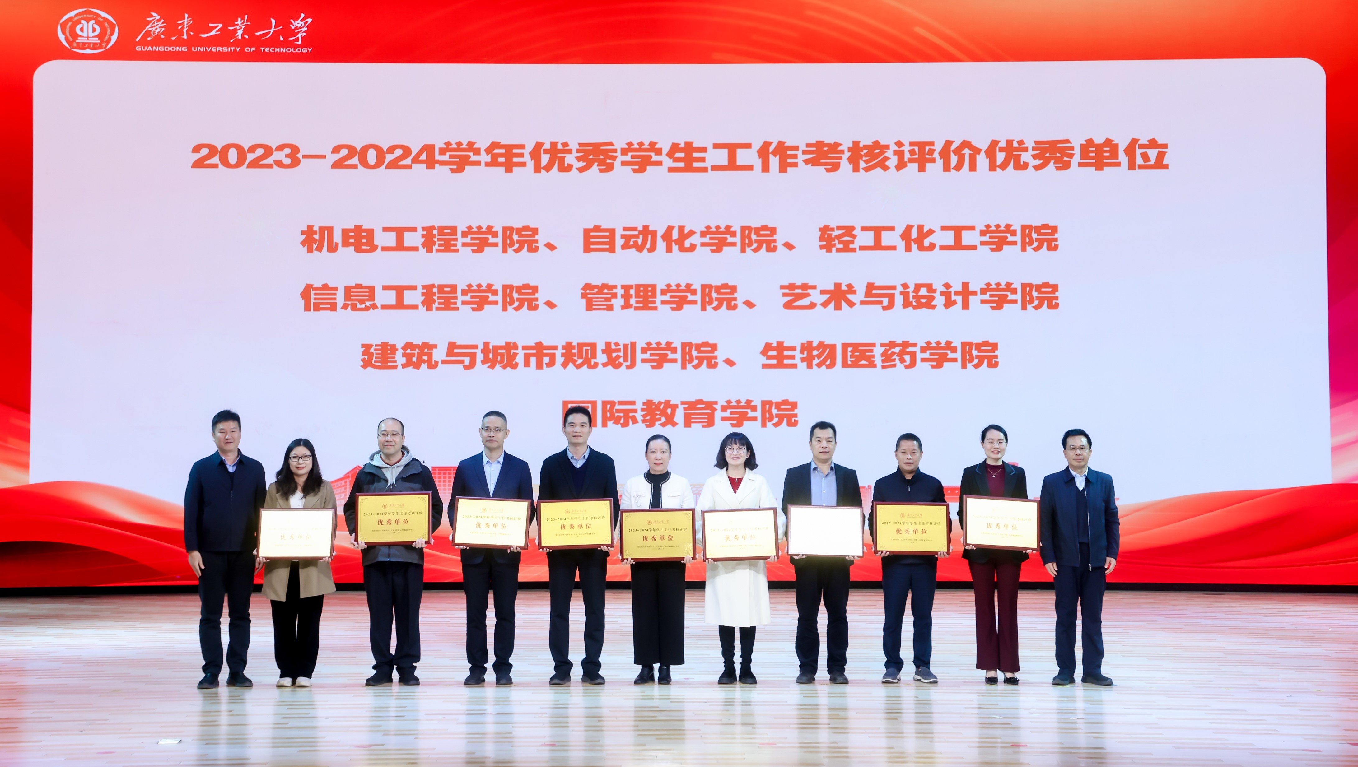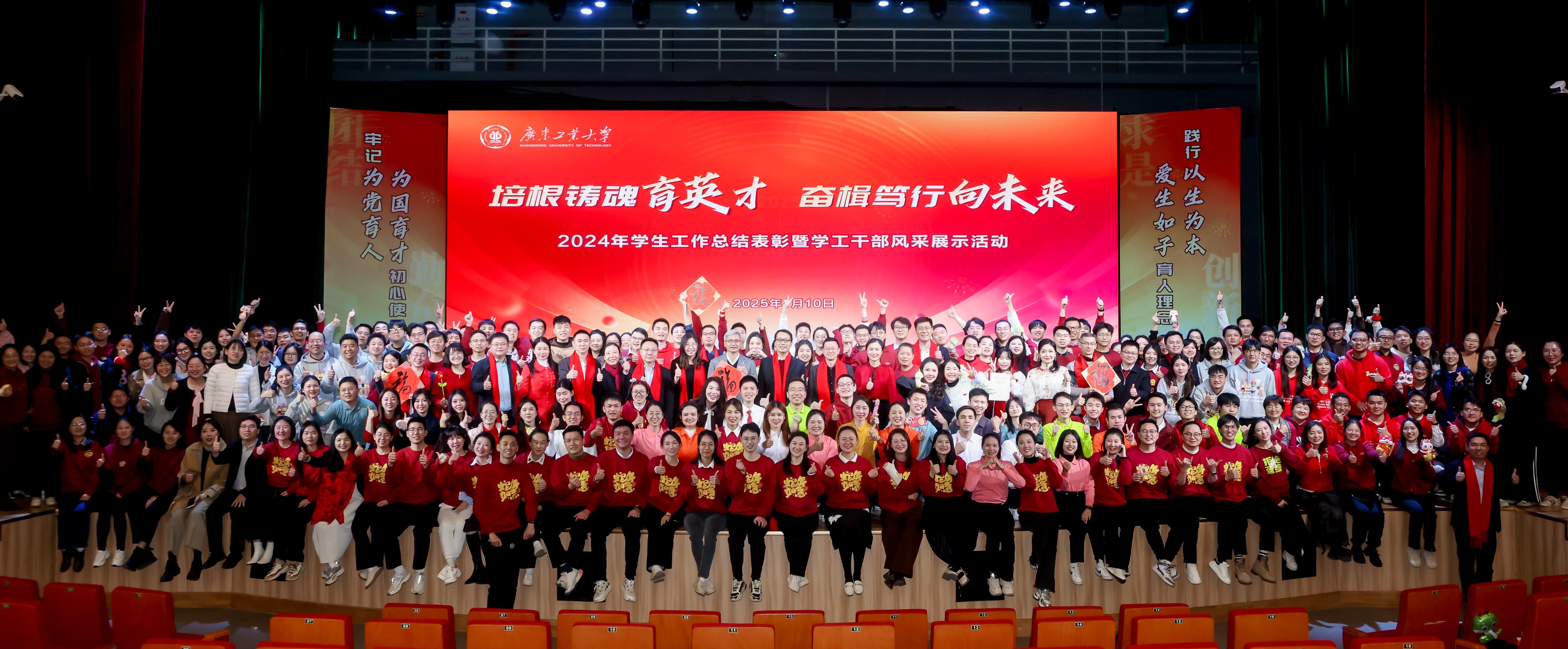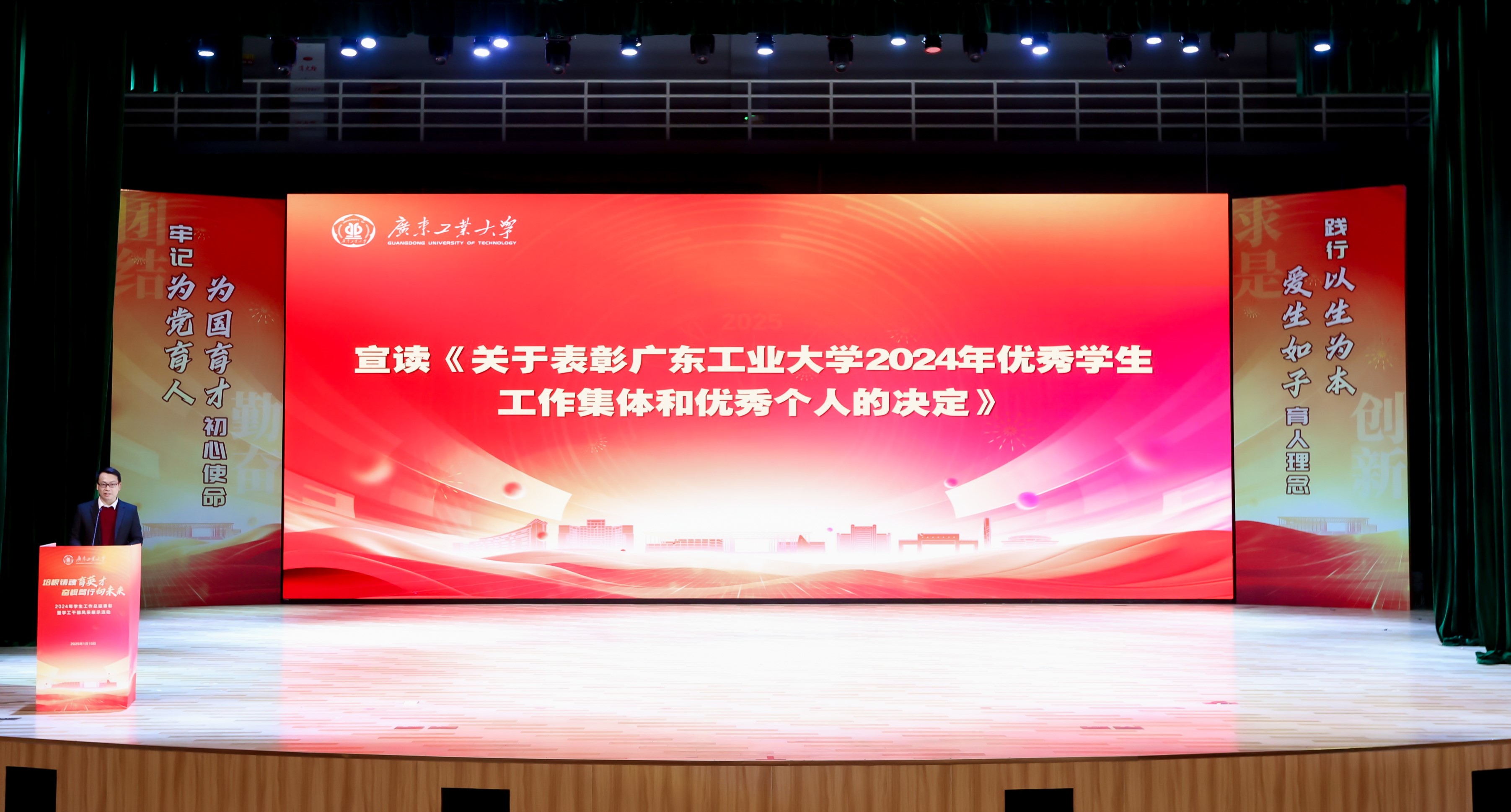 陈卓武代表学校向受表彰的集体与个人表示祝贺,也向所有默默坚守耕耘在学生教育管理服务一线的学工干部送上问候与祝福。他就贯彻落实好2025年全国教育工作会议精神,向全体学工干部提出三点希望和要求:一是要围绕中心大局,不断提升学生工作在学校高质量发展进程中的彰显度。要以实现内涵式发展为目标不断促进学生工作守正创新,着力打造具有广工特色的立德树人模式,以更高质量学生工作体系为学校改革发展提供源源不断的有力支撑。二是要坚持以生为本,不断提升学生工作在学校拔尖人才培养中的贡献度。要加强全过程学生教育引导,将学风建设融入教育教学、管理服务、宣传引导等各项工作中,营造诚实守信、勤奋刻苦、崇尚创新、勇攀高峰的浓厚学习氛围。三是要突出问题导向,不断提升学生工作在学生校园学习生活中的满意度。要充分发挥协同育人作用,把解决学生各类实际问题作为打开工作局面的突破口,不断提升学生工作服务质量与水平,与学生真正实现“双向奔赴”,引领学生争做爱校荣校、兴校强校的广工人。