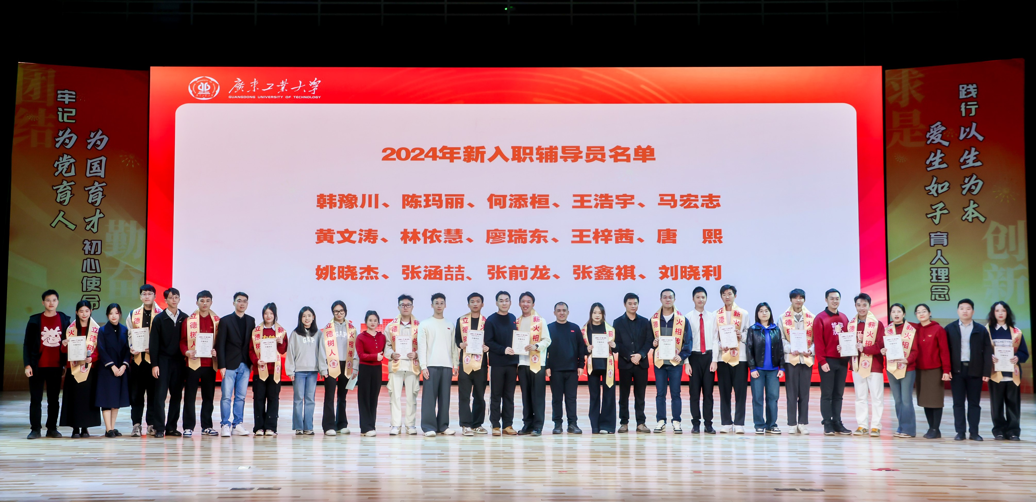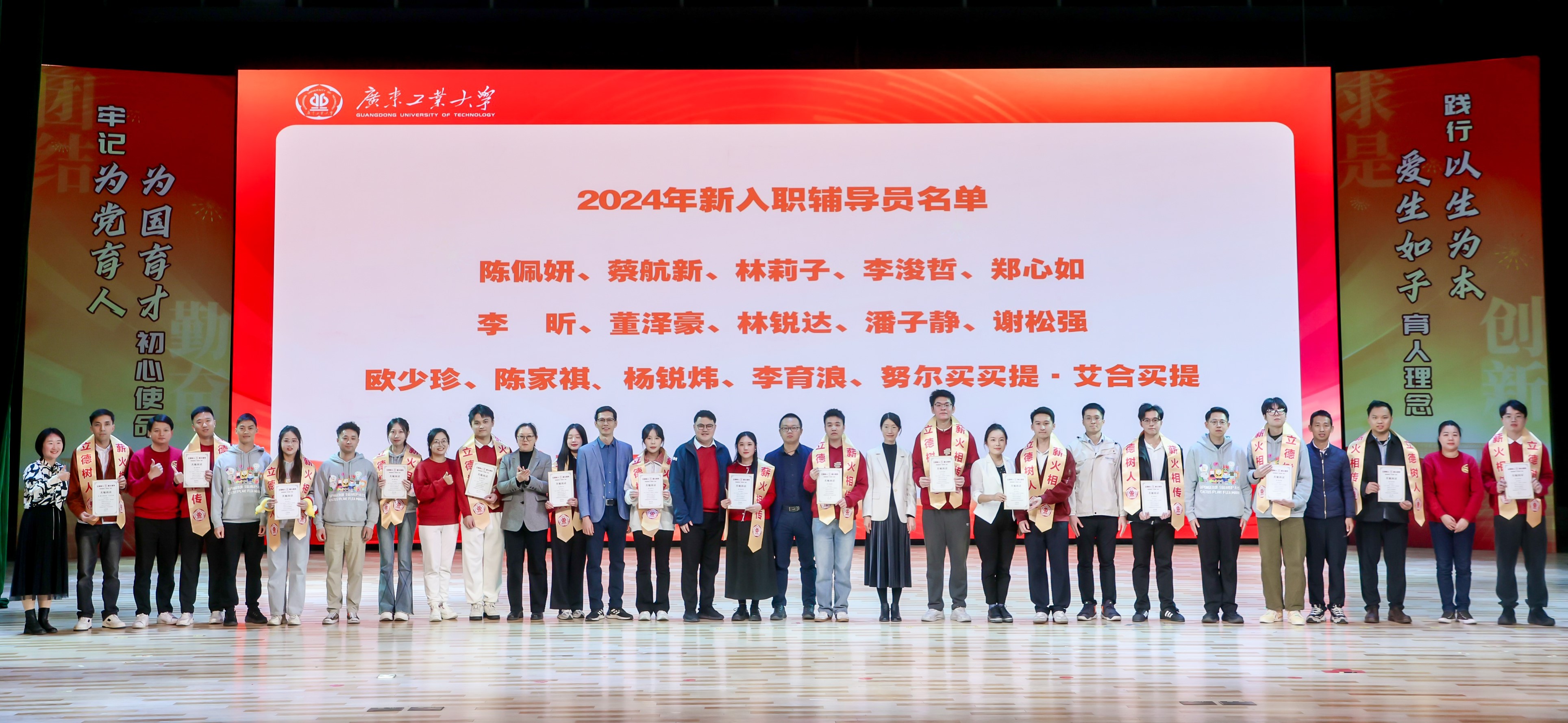 会上还举行了新老辅导员“传帮带”结对仪式。学工部为2024年新入职的辅导员分别选聘“前辈”辅导员担任工作上的导师,进一步加强新老辅导员工作经验的研讨分享,实现在育人事业上的共建共进,发扬好广工学工队伍“传帮带”的优良传统。仪式上,辅导员导师代表为新入职辅导员代表颁授“薪火相传,立德树人”绶带及“共勉的话”纪念证书。