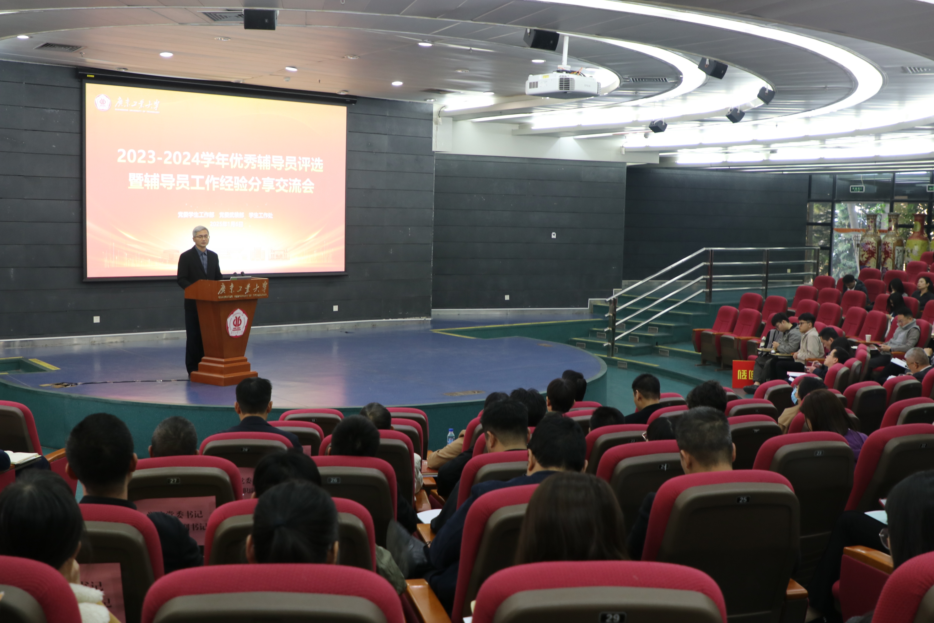 学校学工部按照学校党委《关于进一步加强辅导员队伍建设的实施办法》工作要求,紧扣政治思想建设、素质能力提升与个人成长发展等方面出实招,求实效,联动相关职能部门着力为辅导员发展提供更多有力支持。前不久,党委学生工作部在大学城校区大讲堂二楼圆弧报告厅举行了2023-2024学年优秀辅导员评选暨辅导员工作经验分享交流会。陈卓武出席并作总结讲话,党委组织部、党委学生工作部、研究生院、校团委、心理健康教育中心等部门相关负责人,各学院党委书记、党委专职副书记,全体辅导员参加会议。