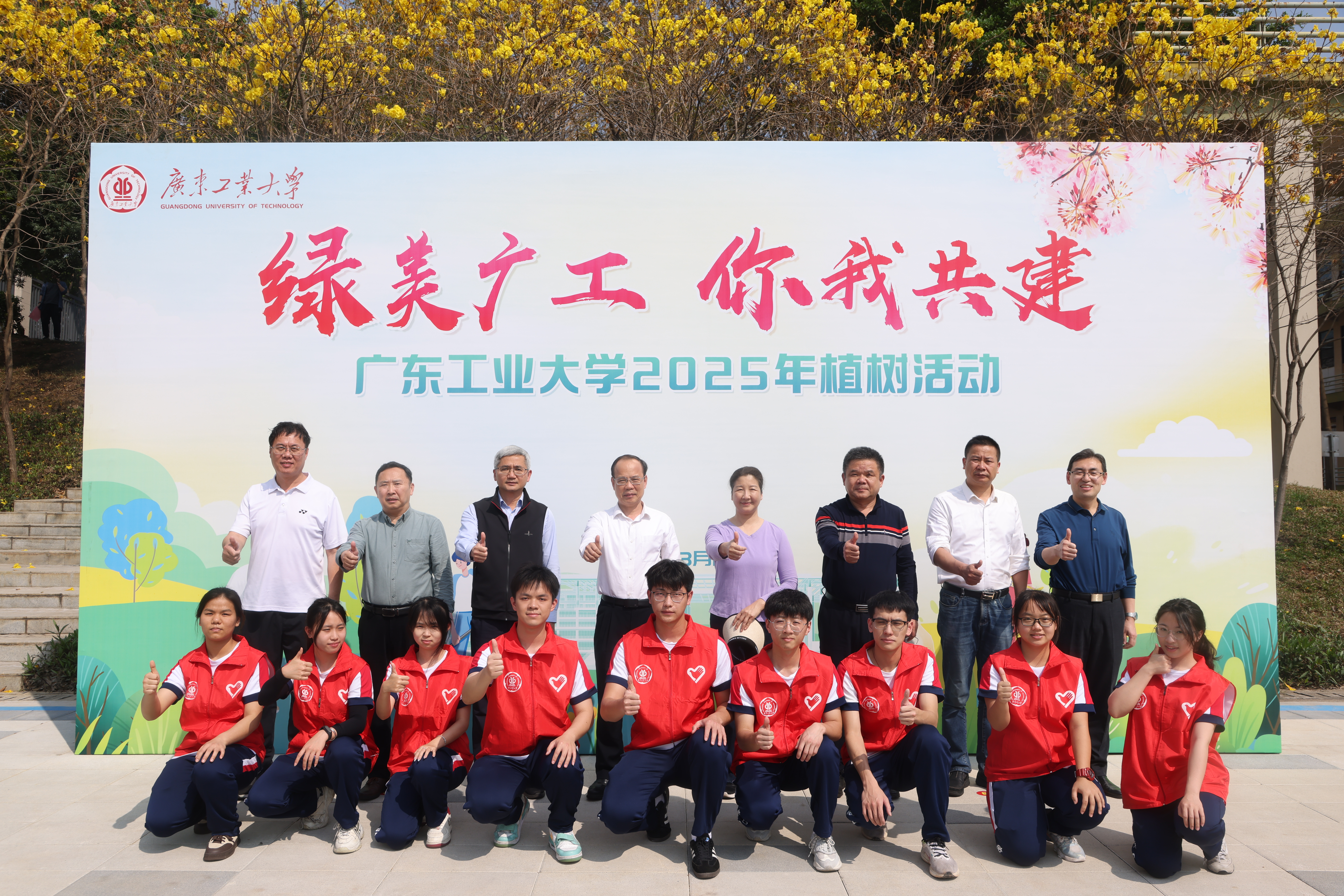 3月12日植树节,广工师生共同播种希望,在大学城校区科创实训楼A栋西侧口袋公园开展“绿美广工,你我共建”主题植树活动,开启了校园春天的模式。