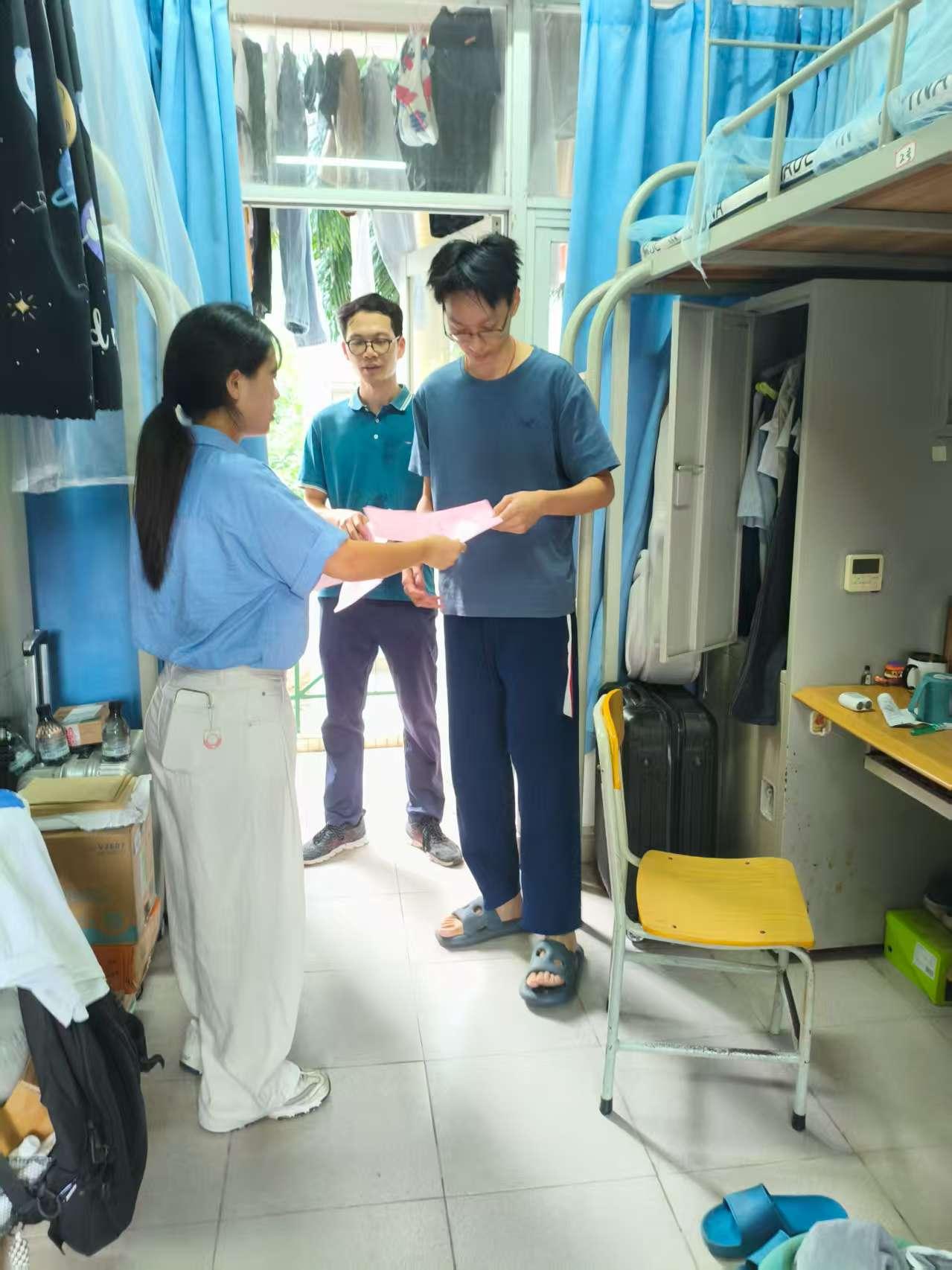层层递进动态管理,做好学生疫情防控。党委学生工作部发动全体留校学生开展宿舍卫生大扫除,组织各学院学工干部重点就学生宿舍的室内积水、地面卫生、垃圾下楼等风险隐患开展100%全覆盖宣传、走访和督查,教育学生加强防控知识学习,引导学生树立健康管理意识,同步建立学工内部上报响应机制并设置准备健康观察室,全面落实上级部门疫情防控要求与工作部署。