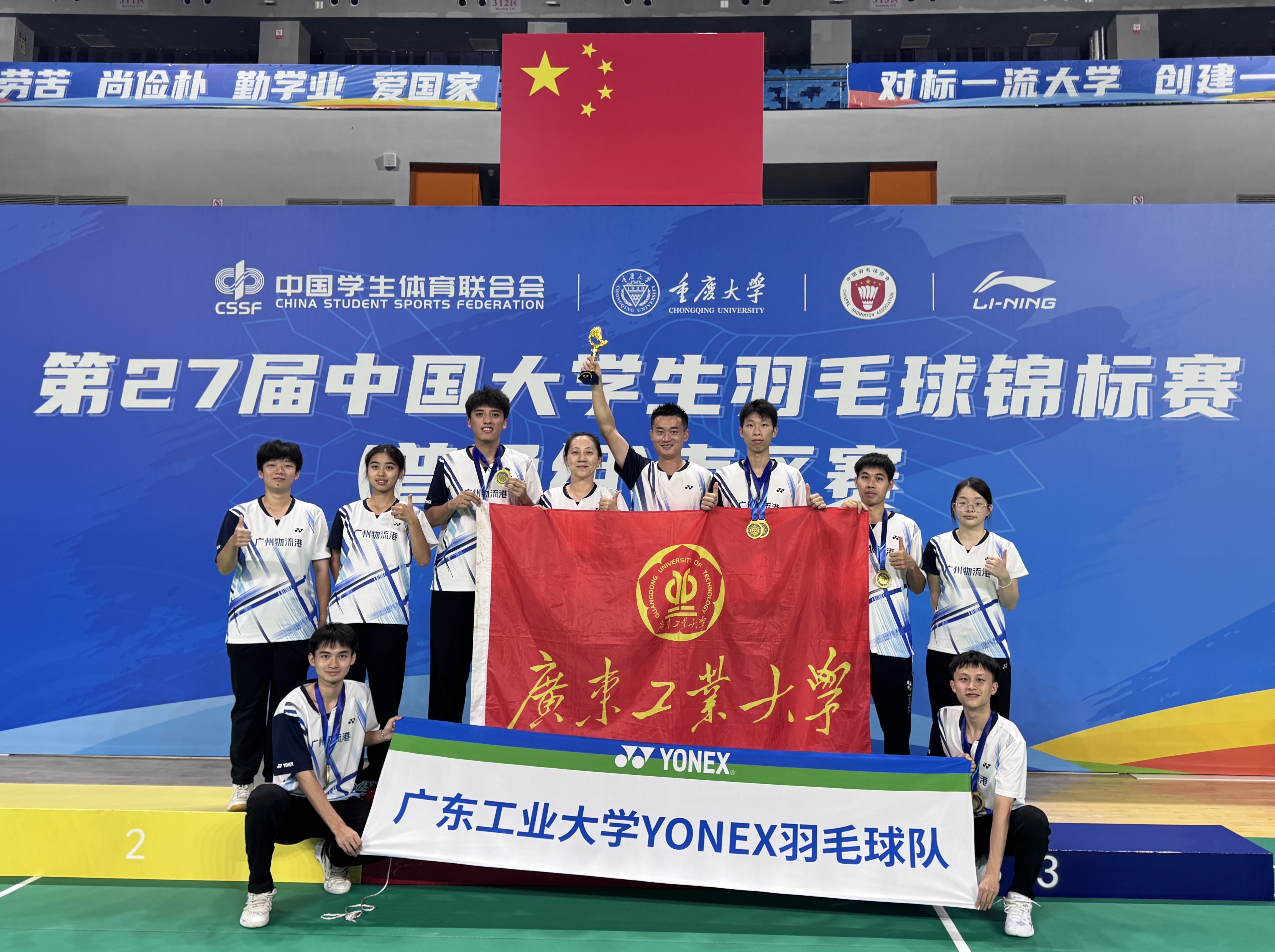 9月19日至27日,第27届全国大学生羽毛球锦标赛(普通组)南区赛在重庆大学开赛。本次赛事由中国学生体育联合会主办、中国学生体育联合会大学羽毛球分会执行、重庆大学协办,吸引了全国南区30所高校的600余名运动员同场竞技。广工羽毛球队历经7天高强度比拼,一举斩获甲组男子团体冠军,在单项赛场更展现绝对实力,男子双打项目包揽冠亚军,均顺利拿到全国总决赛入场券。