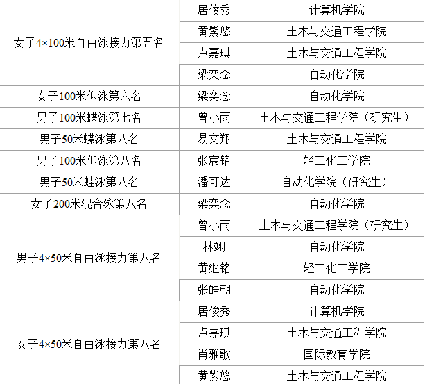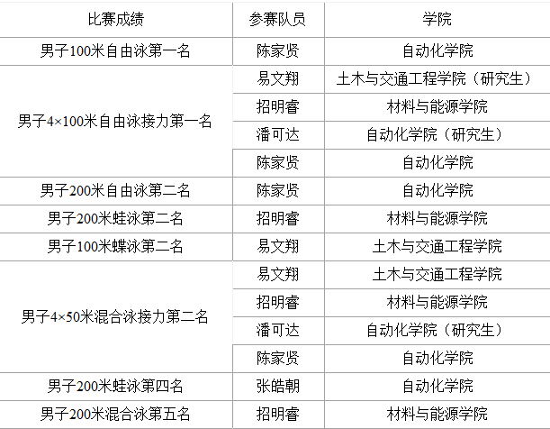 在激烈的角逐中,我校游泳队获得甲组男子100米自由泳和男子4×100米自由泳接力两枚金牌,男子200米自由泳、男子200米蛙泳、男子100米蝶泳和男子4×50米混合泳接力四枚银牌, 男子甲组团体总分第四名等优异成绩。