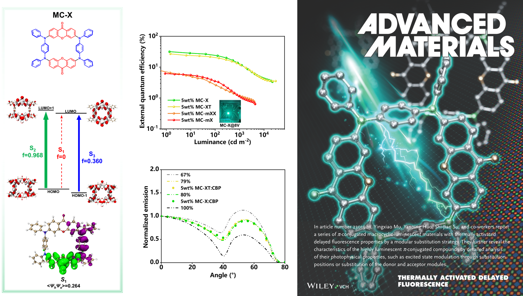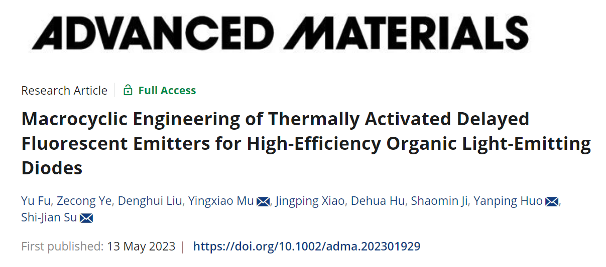 我校轻工化工学院穆英啸副教授最新研究成果“Macrocyclic Engineering of Thermally Activated Delayed Fluorescent Emitters for High-Efficiency Organic Light-Emitting Diodes”作为Frontispiece论文在材料科学领域国际顶级学术期刊《Advanced Materials》上发表。该期刊2022-2023年度最新影响因子为29.4,CiteScore为45.5。该论文以华体会·官方版网站登录入口为第一完成单位,穆英啸副教授和霍延平教授为通讯作者,硕士研究生付裕和叶泽聪副教授为共同第一作者(论文DOI: 10.1002/adma.202301929),主要测试工作由分析测试中心提供技术支持。