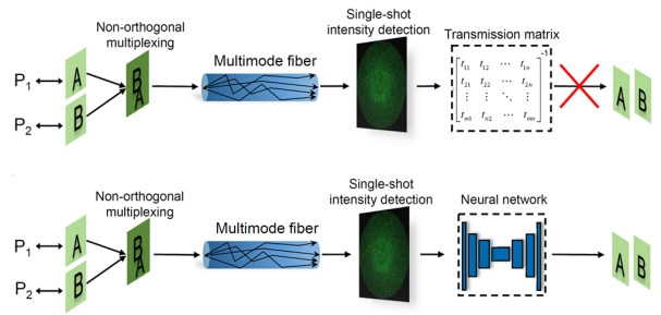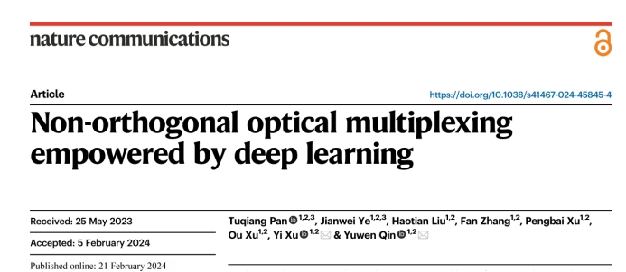 近日,我校信息工程学院秦玉文教授领导的研究团队在多模光纤的非正交光信息复用传输方面取得重要进展,研究成果(即论文标题)“Non-orthogonal optical multiplexing empowered by deep learning”于2024年2月21日发表在国际顶级综合性学术期刊《Nature Communications》(影响因子:16.6),这是信息工程学院首次以第一单位在Nature子刊发表研究论文。信息工程学院2021级硕士生潘土强和叶建伟为共同第一作者,论文通讯作者为徐毅教授和秦玉文教授,研究工作依托通感融合光子技术教育部重点实验室和广东省信息光子技术重点实验室,华体会·官方版网站登录入口为论文唯一完成单位。