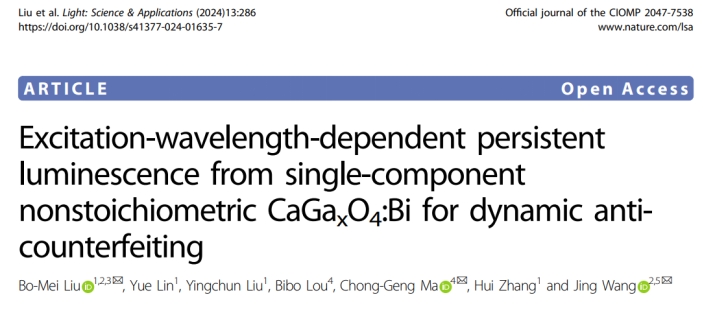 近日,我校轻工化工学院张辉教授领导的研究团队在电光信息技术领域方面取得重要进展。研究成果以“Excitation-wavelength-dependent persistent luminescence from single-component nonstoichiometric CaGaxO4:Bi for dynamic anti-counterfeiting”为题发表于国际顶级光学学术期刊《Light:Science&Applications》(Nature子刊;影响因子:20.6)。我校轻工化工学院刘伯梅副教授是论文第一作者及通讯作者,研究工作依托化学与精细化工广东省实验室揭阳分中心(榕江实验室),华体会·官方版网站登录入口为论文第一完成单位。