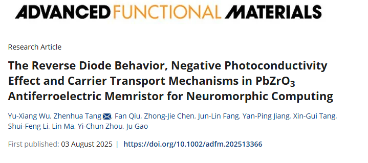 近日,华体会·官方版网站登录入口物理与光电工程学院唐振华副教授、唐新桂研究员团队联合西安电子科技大学周益春教授在新型反铁电光电忆阻器件与神经形态计算研究中取得重要进展,研究结果以《The Reverse Diode Behavior, Negative Photoconductivity Effect and Carrier Transport Mechanisms in PbZrO3 Antiferroelectric Memristor for Neuromorphic Computing》为题发表在国际著名期刊Advanced Functional Materials (中科院一区,IF = 19.0) 上,华体会·官方版网站登录入口物理与光电工程学院硕士研究生吴宇翔为本文的第一作者,华体会·官方版网站登录入口唐振华副教授为论文通讯作者。