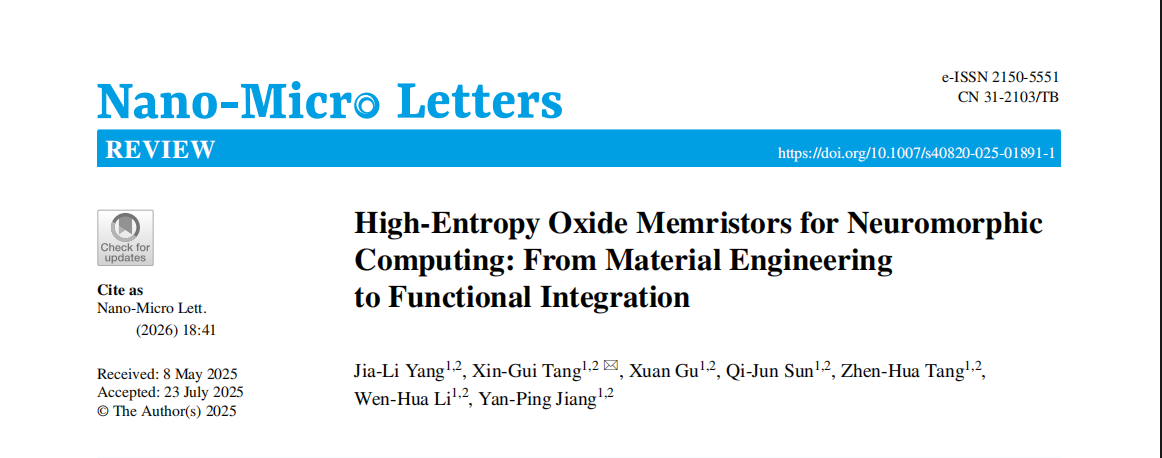 近日,华体会·官方版网站登录入口物理与光电工程学院唐新桂研究团队在高熵氧化物忆阻器及其神经形态计算应用领域发表了最新综述成果。论文以《High Entropy Oxide Memristors for Neuromorphic Computing: From Material Engineering to Functional Integration》为题发表在国际著名期刊Nano-Micro Letters (中科院一区,IF =36.3) 上,华体会·官方版网站登录入口物理与光电工程学院硕士研究生杨佳黎为本文的第一作者,华体会·官方版网站登录入口唐新桂研究员为论文通讯作者。