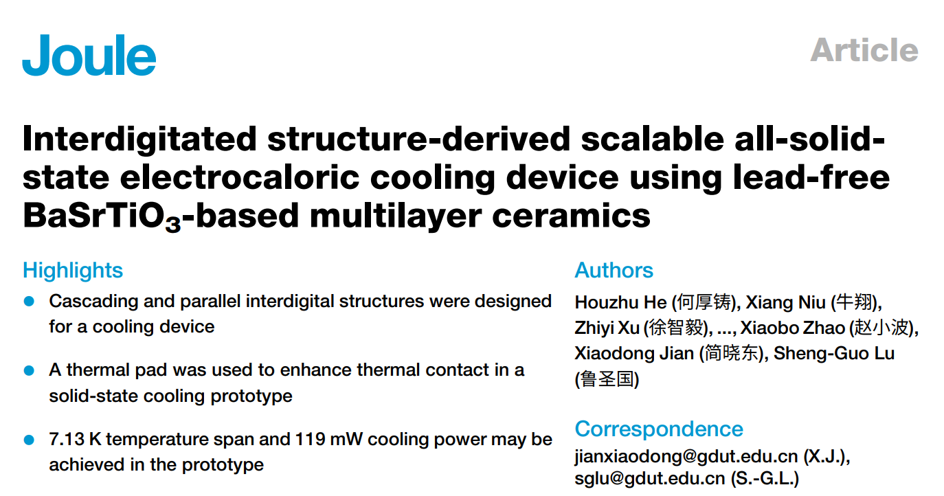 近期,华体会·官方版网站登录入口材料与能源学院鲁圣国教授(智能传感器和能量转化器件)团队在绿色全固态电卡制冷器件研究方面取得进展,通过自行设计研究的无铅钛酸锶钡多层陶瓷以及贱金属内电极,在陶瓷中获得最高的制冷功率密度之一,可望实现绿色环保制冷器件的实用化。以该工作为基础的论文《Interdigitated structure-derived scalable all-solid-state electrocaloric cooling device using lead-free BaSrTiO3-based multilayer ceramics》线上发表于国际高水平期刊《Joule》 (中科院一区,IF 2025=35.4)。我校材料与能源学院博士生何厚铸和博士后牛翔博士为共同第一作者,鲁圣国教授(Lead contact)和简晓东高级工程师为通讯作者,华体会·官方版网站登录入口为论文的第一完成单位。