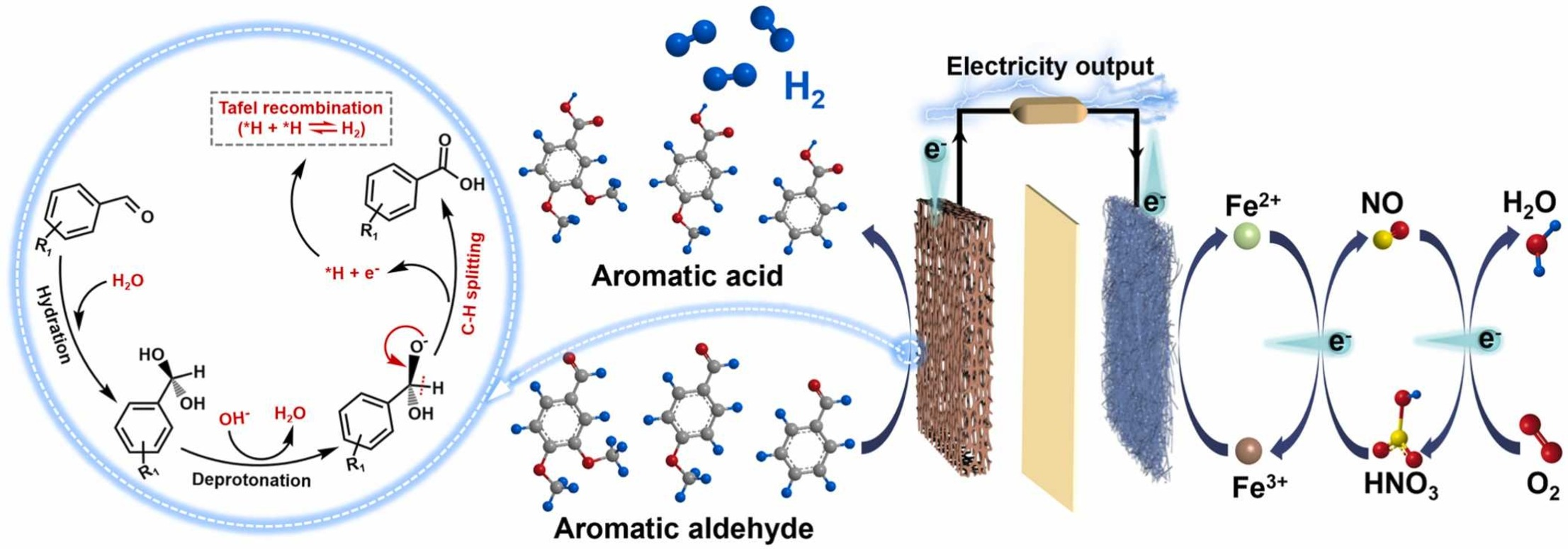 传统水电解制氢能耗高,而生物质电解虽能耦合有机物氧化与产氢,但仍需外部供电,且存在法拉第效率低、副反应多等问题。将液流燃料电池与低电位有机物氧化反应相结合,是一种构建零耗电甚至耦合发电制氢的新思路。研究团队创新性地开发了具有 Cu0/Cu+混合价态、高活性比表面积、适宜吸附能力的 Ag-CuxO/CF 阳极电催化剂,使木质素衍生醛中的醛基在低电位氧化产氢同步释放电子至电池阳极,电子通过外电路传输至阴极,与高电位阴极电解液中的Fe3+发生还原反应形成闭合回路,实现产氢的同时高效发电。通过原位DEMS、原位Raman、原位FTIR等表征手段,证实了H2来源于醛基的C-H键,揭示了木质素衍生醛氧化产氢的机理是醛基在低电位(0~0.5 VRHE)氧化过程中发生C-H键断裂,释放出电子和氢原子(*H),两个*H重组形成H2。该新型电池将传统制氢的耗电过程转变为发电过程,室温下电池功率密度达173.5 mW cm-2,优于已报道生物质燃料电池的室温发电性能,同时,产氢速率达1.96 mmol cm-2 h-1,与生物质电解制氢的产氢速率相媲美。该成果高效节能,兼具发电和产氢双重功能,在室温下将传统制氢的耗电过程转变为高效发电过程,为开发绿色节能的制氢技术和绿电行业发展提供了新思路。