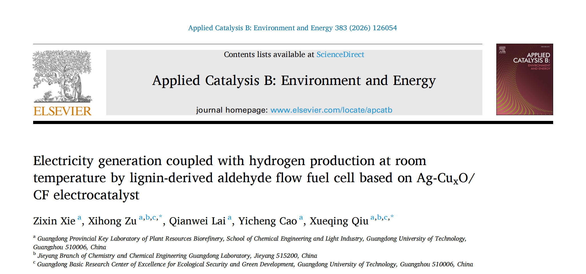 近日,我校轻工化工学院邱学青教授团队在生物质燃料电池和制氢领域取得突破性研究进展。研究成果以“Electricity generation coupled with hydrogen production at room temperature by lignin-derived aldehyde flow fuel cell based on Ag-CuxO/CF electrocatalyst”为题,于2025年10月8日发表于环境和能源催化领域顶刊Applied Catalysis B: Environment and Energy。通讯作者为俎喜红教授和邱学青教授,第一作者为硕士研究生谢子鑫。